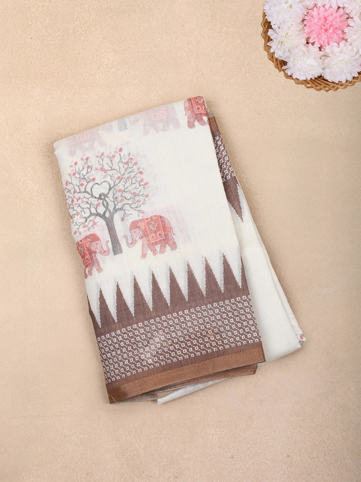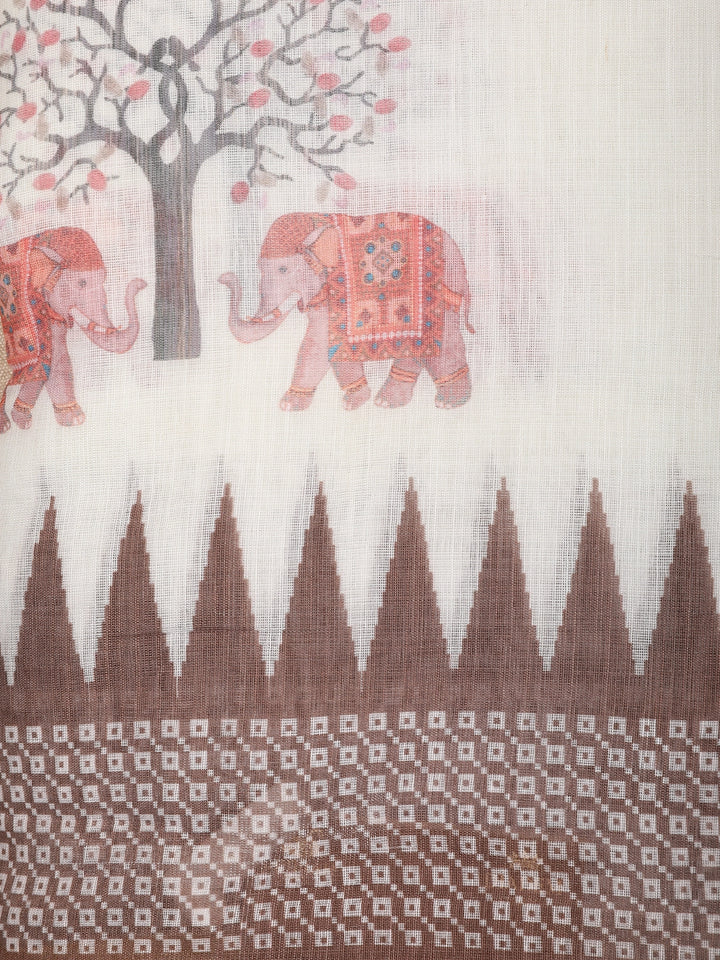 White Elephant Printed Linen Cotton Saree with Contrast Brown Border