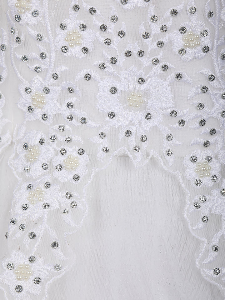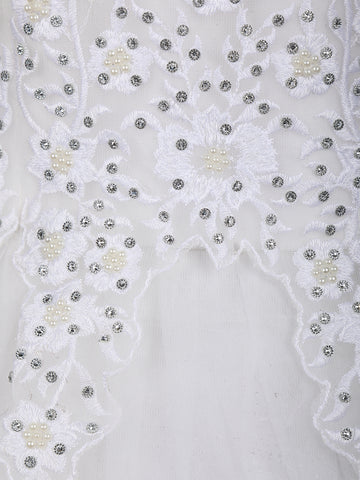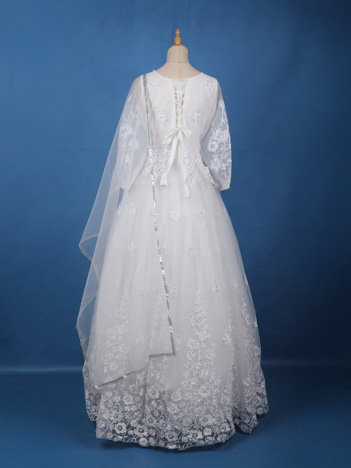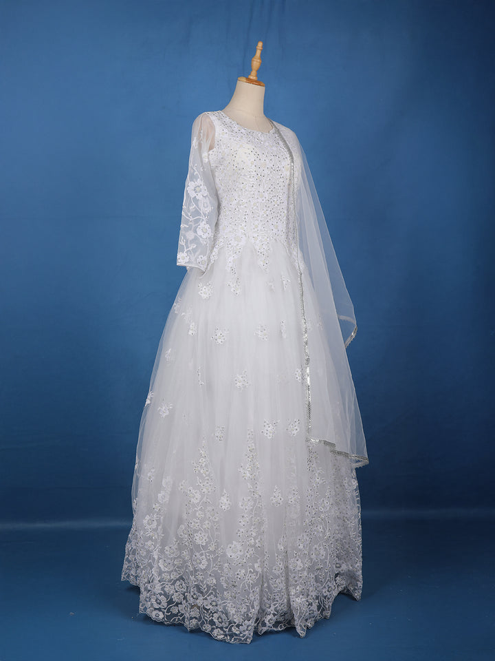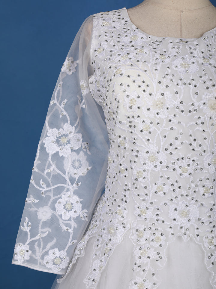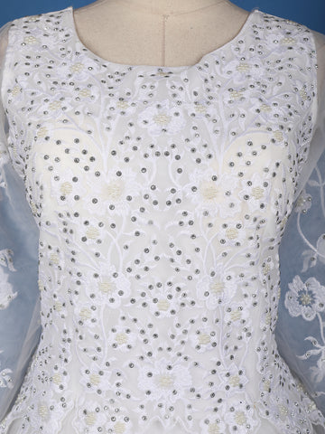 Radiate timeless beauty in this White Floral Embroidered Net Gown, a masterpiece of grace and elegance crafted to make every occasion unforgettable. The gown features intricate floral embroidery delicately adorned with sequins, giving it a subtle shimmer that glows with sophistication.