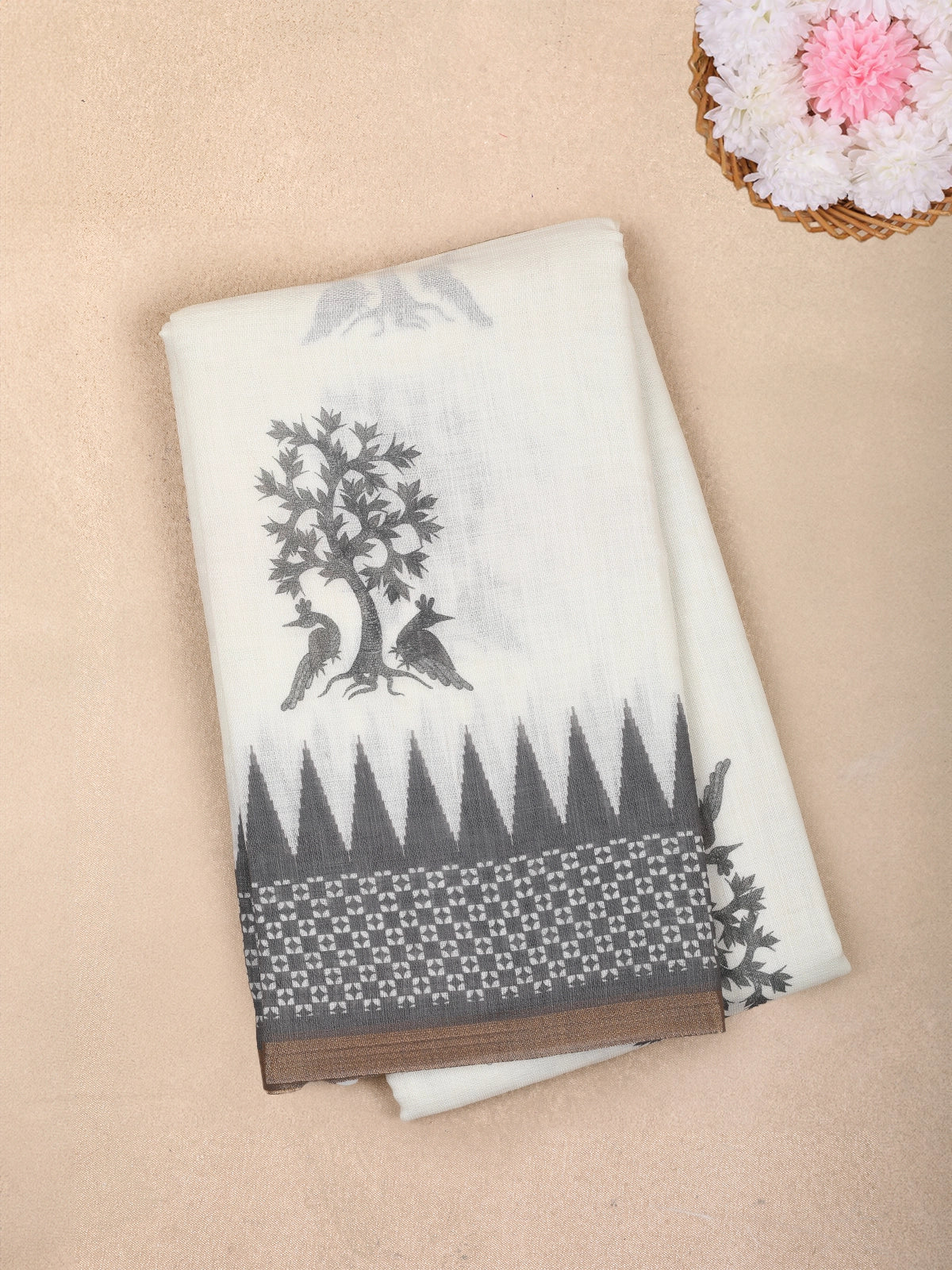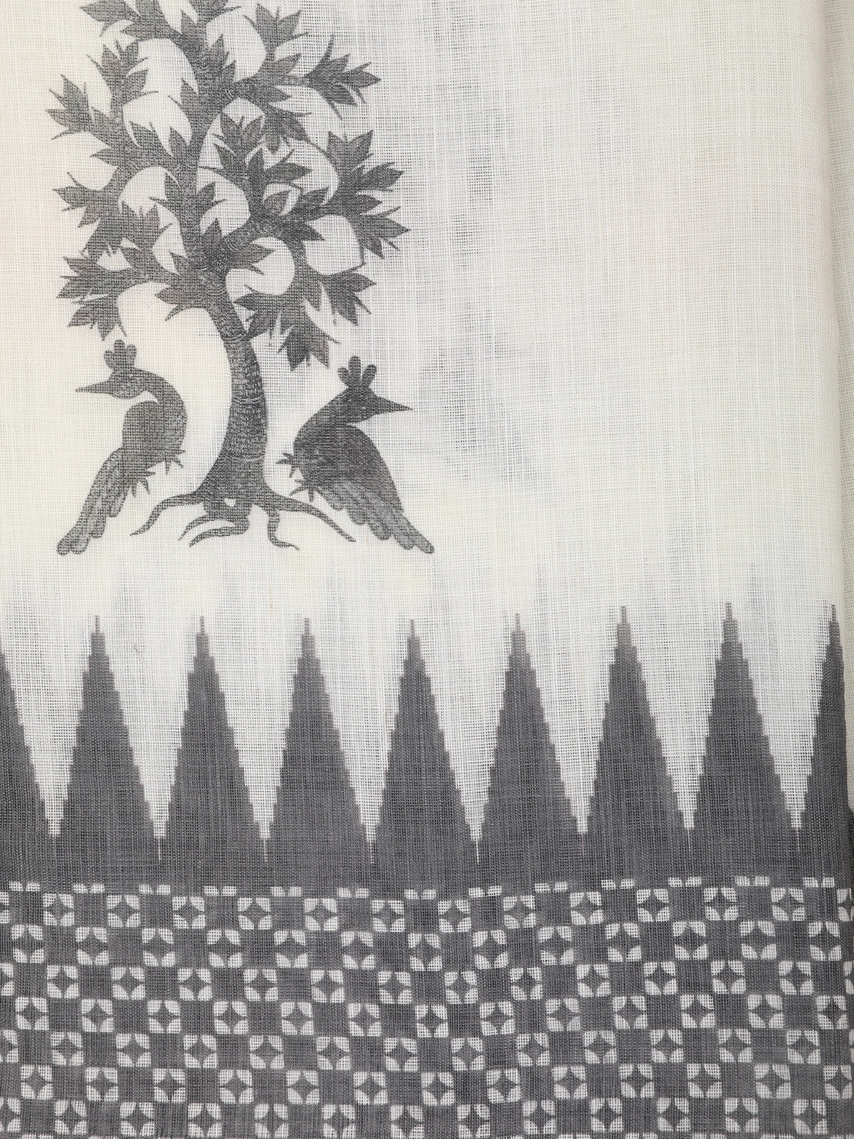 The serene white base is beautifully enhanced with charcoal grey Ikat geometric patterns along the border and pallu. The contrast woven border in grey and brown tones adds a grounded, refined finish, giving the saree a timeless appeal. The minimal yet artistic motifs give the saree a clean, graceful, and naturally elegant look.