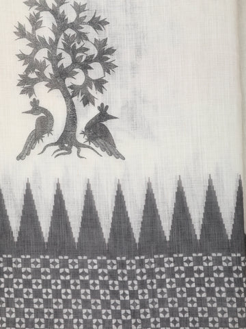 White Ikat Printed Design Linen Cotton Saree with Contrast Woven Border