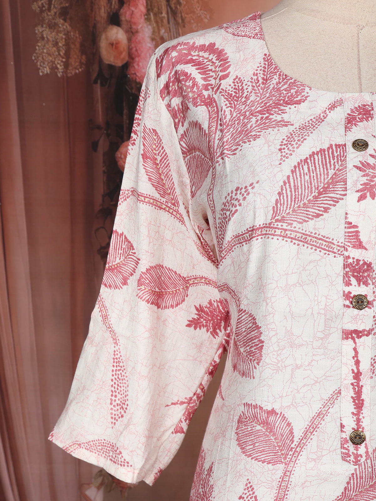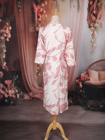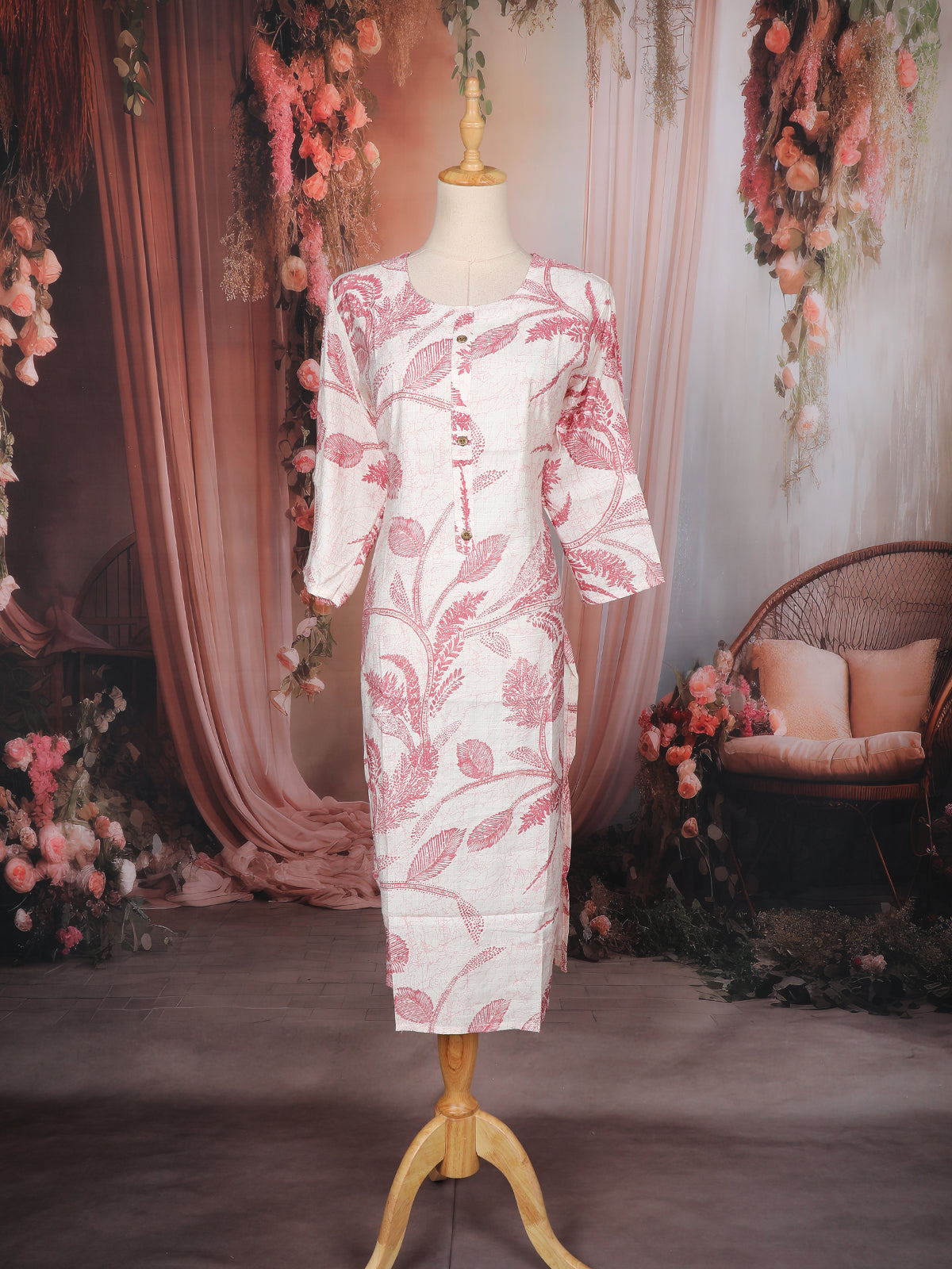 The graceful round neckline and stylish front button placket elevate the simple silhouette with a touch of elegance. 3/4 sleeves , enhancing the kurti’s feminine appeal. The soft pink leaf motifs beautifully spread across the white base, creating a soothing and naturally chic aesthetic.