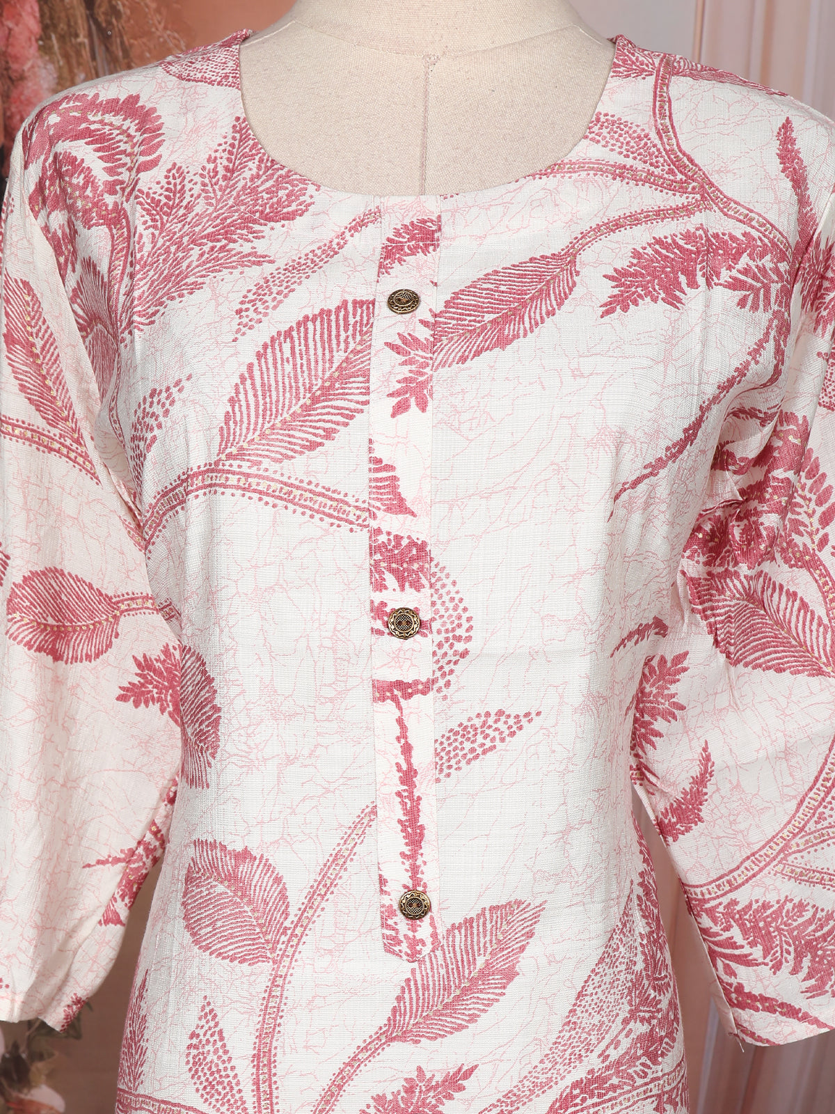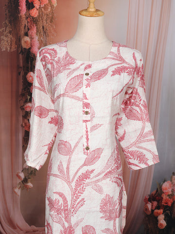 Add a refreshing and charming touch to your ethnic wardrobe with this White & Pink Leaf Printed Cotton Straight Kurti. Crafted from breathable cotton, this kurti ensures lasting comfort, making it your go-to choice for casual outings, office wear, or daily styling.