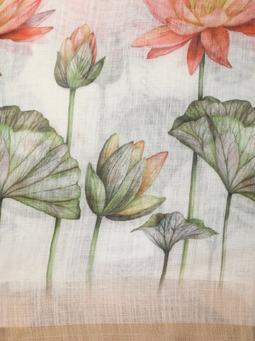 White Lotus Floral Printed Linen Cotton Saree with Subtle Contrast Border