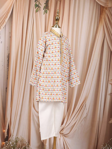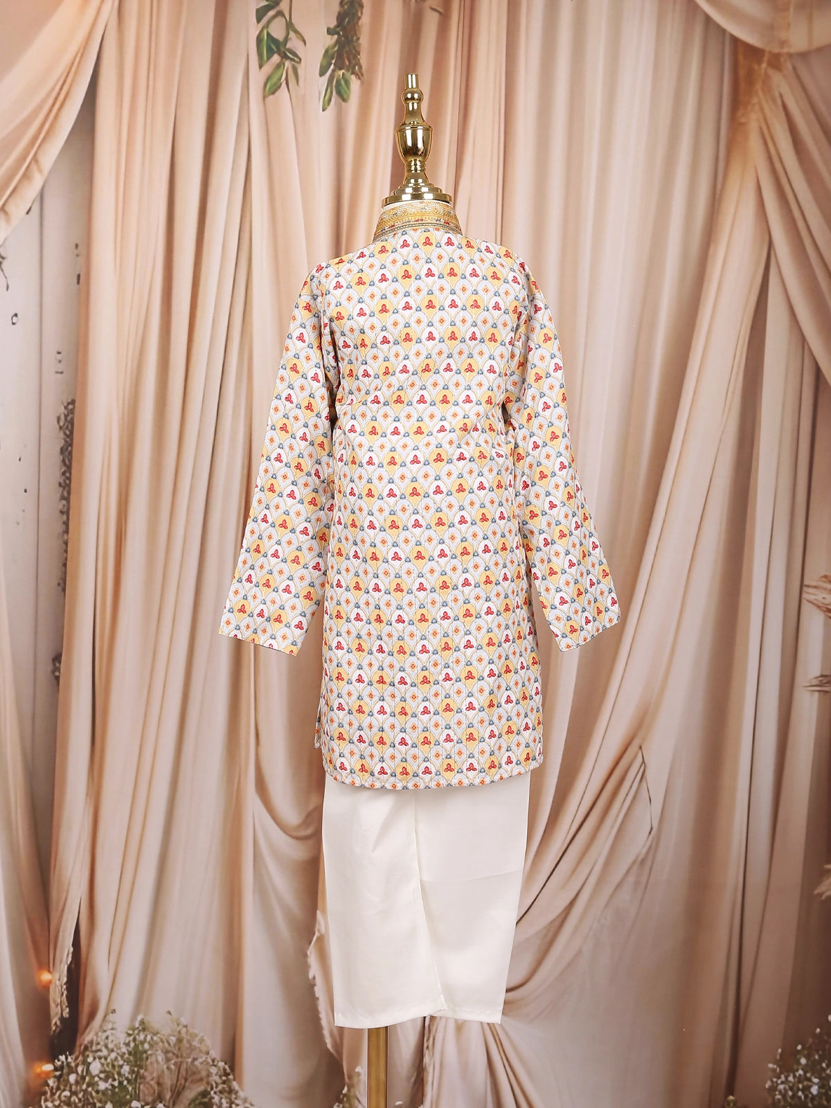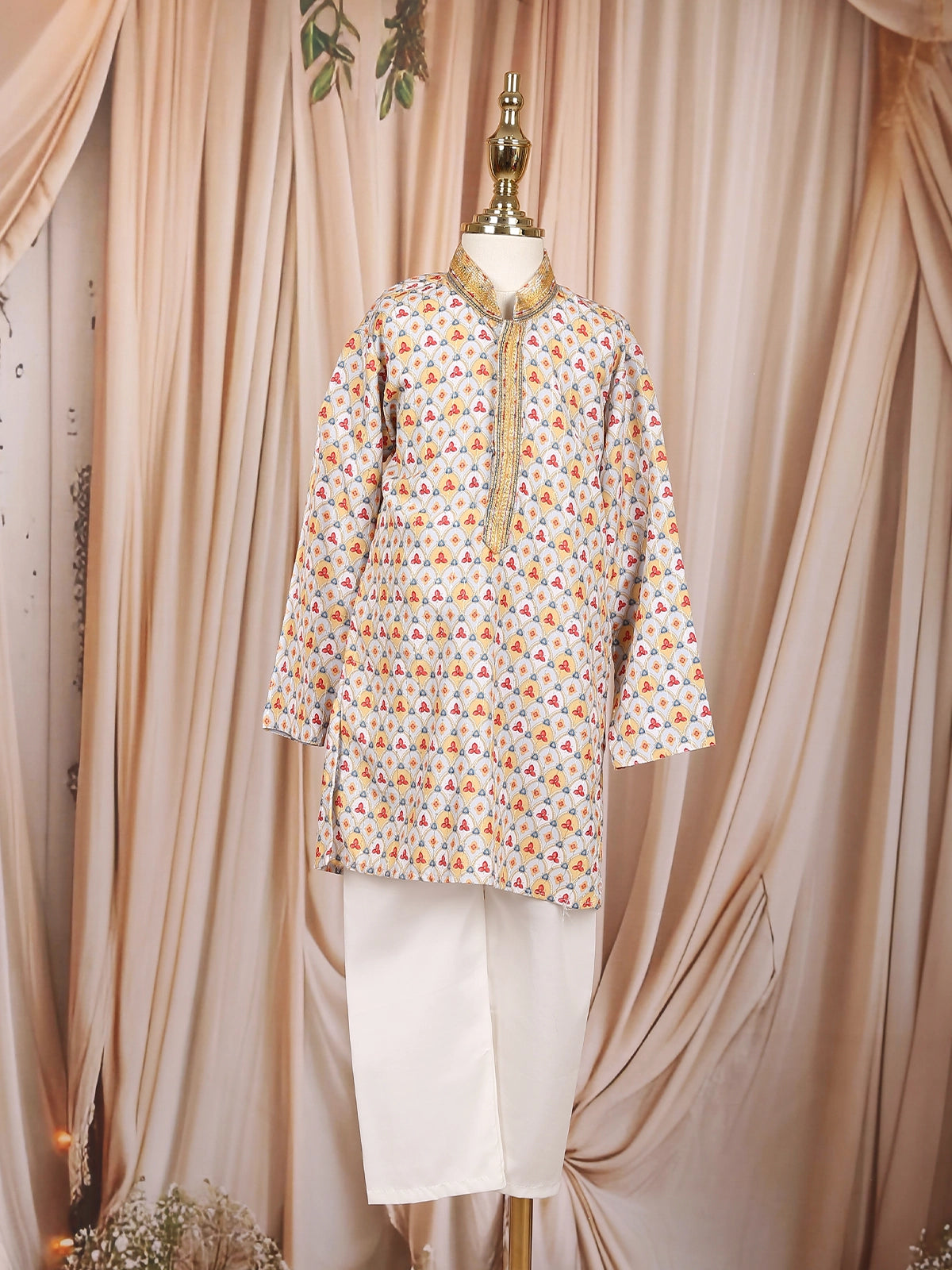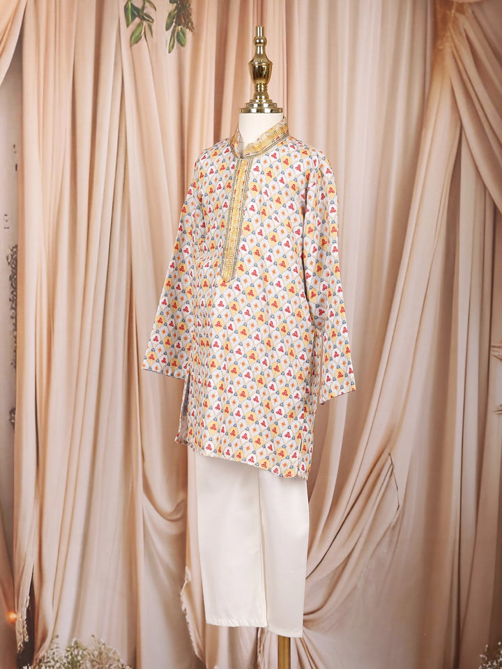 The kurta features a bright and playful floral woven design in multiple colors, adding a vibrant touch that kids will love. The golden embroidered neckline enhances its traditional beauty, making it perfect for celebrations and family gatherings. Paired with a comfortable white cotton pajama, this set blends simplicity with festive flair.