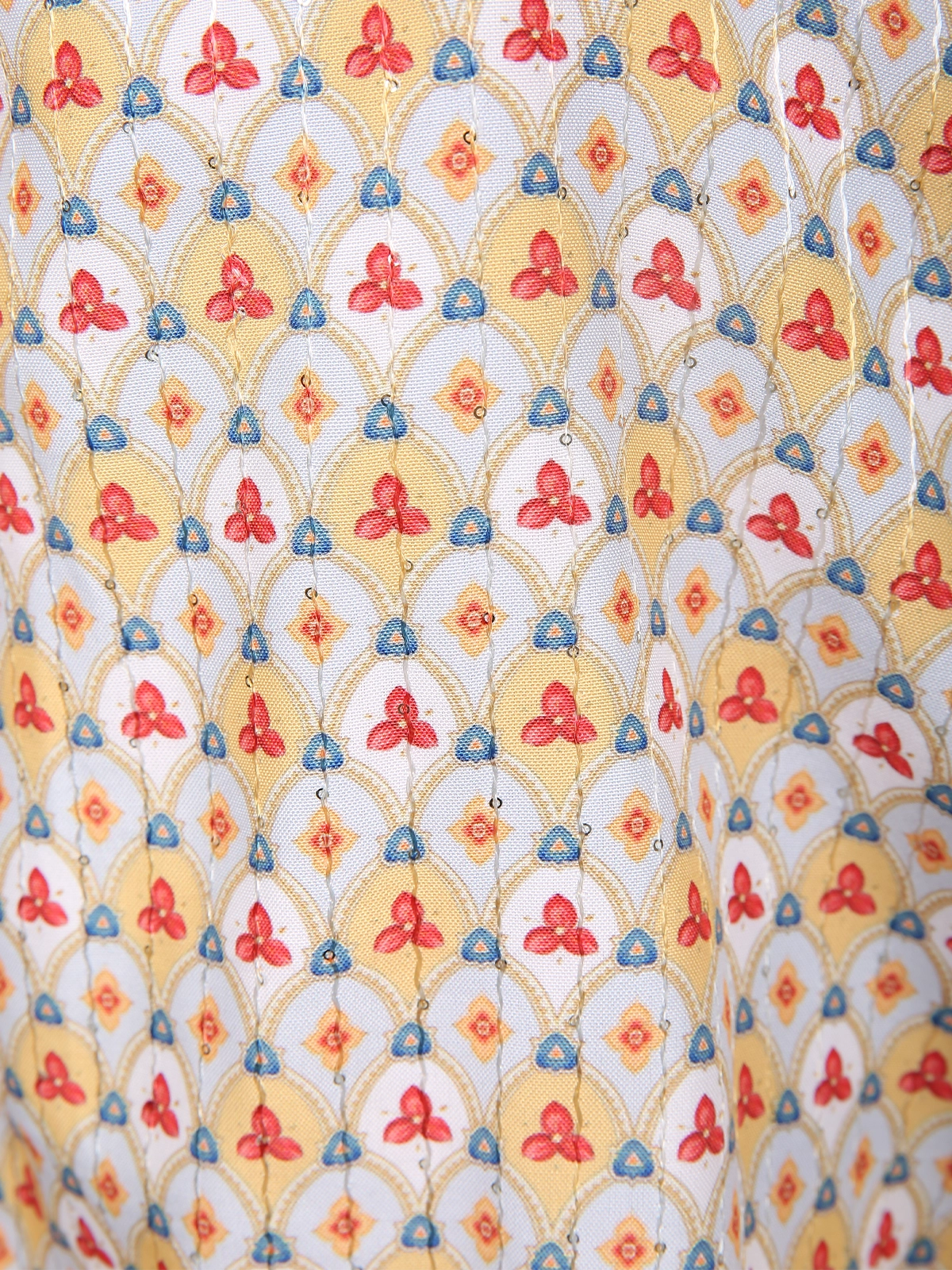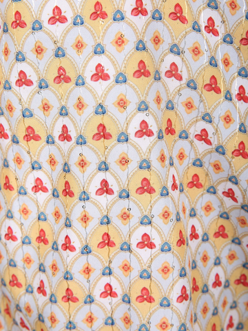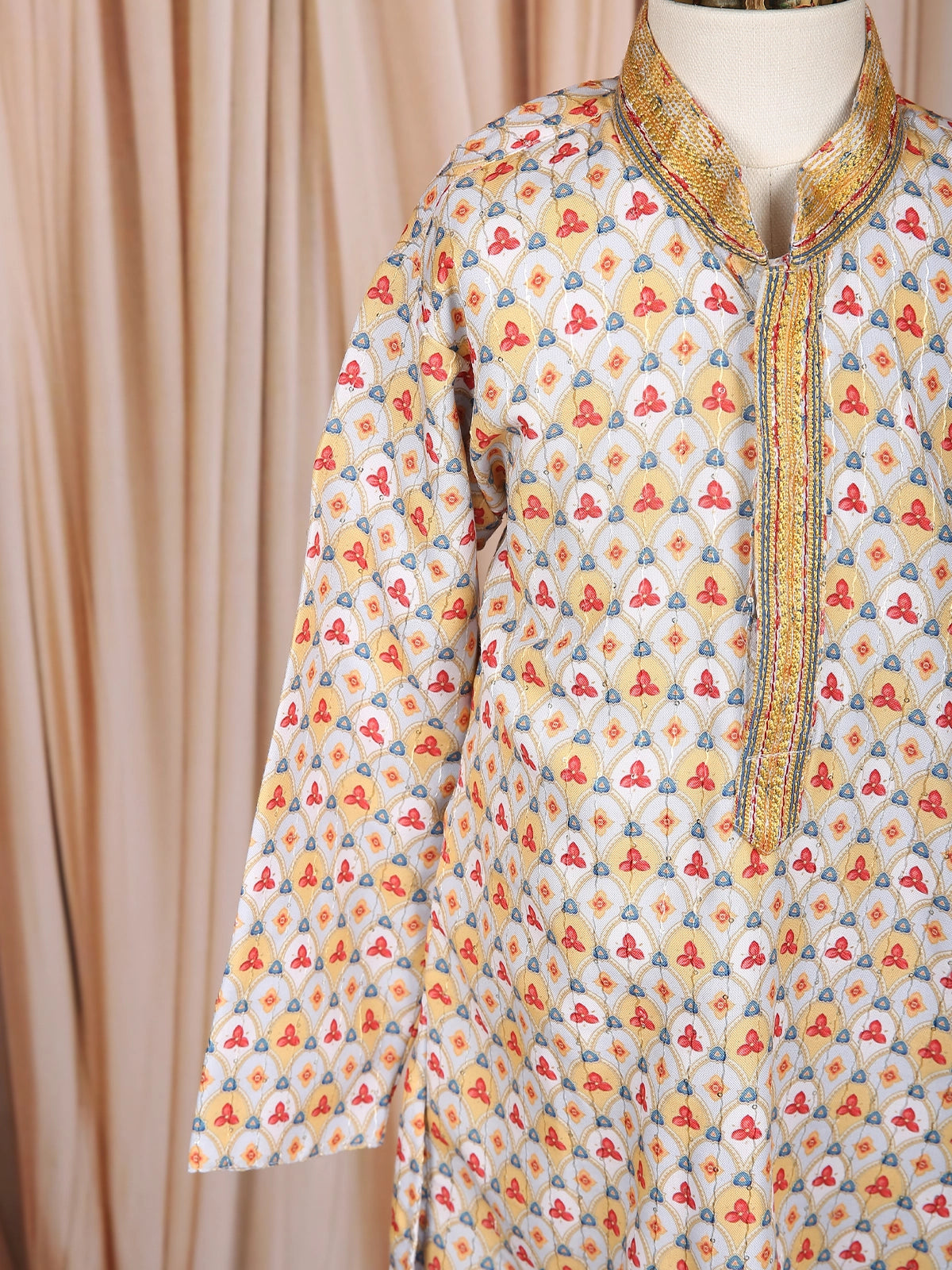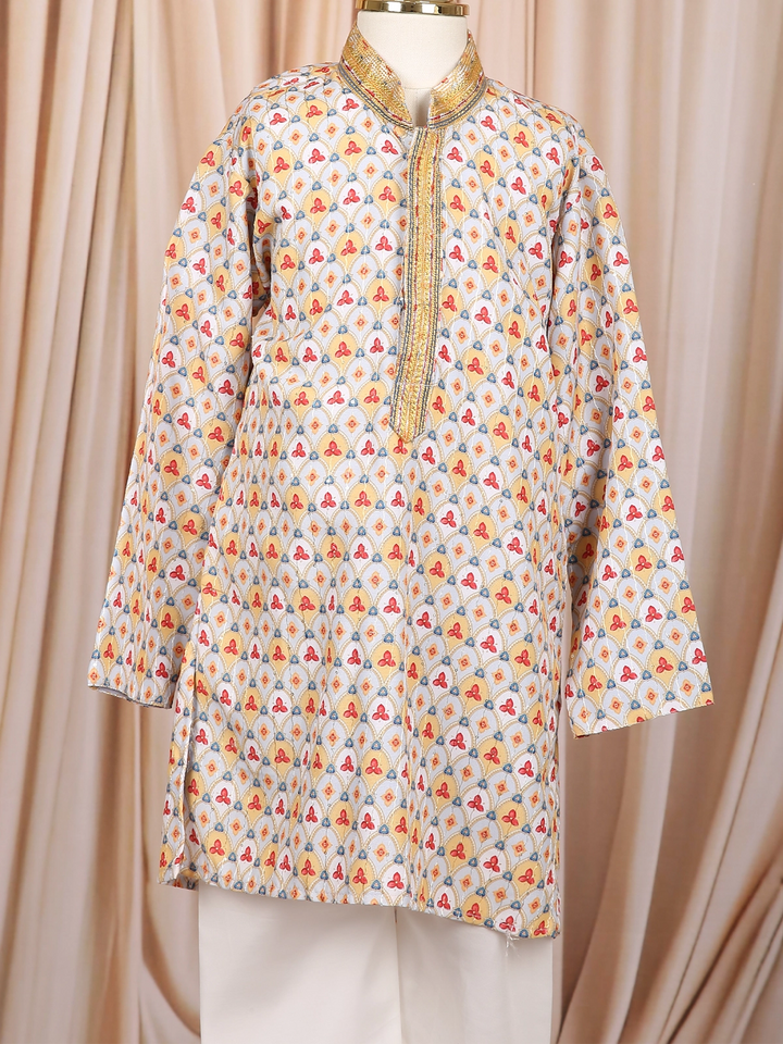 The kurta features a bright and playful floral woven design in multiple colors, adding a vibrant touch that kids will love. The golden embroidered neckline enhances its traditional beauty, making it perfect for celebrations and family gatherings. Paired with a comfortable white cotton pajama, this set blends simplicity with festive flair.