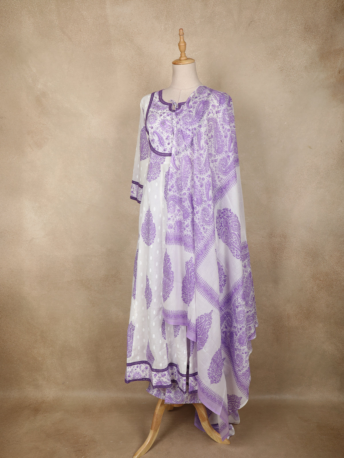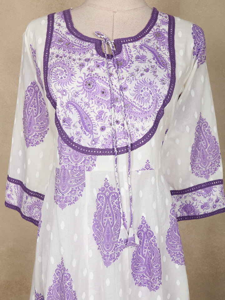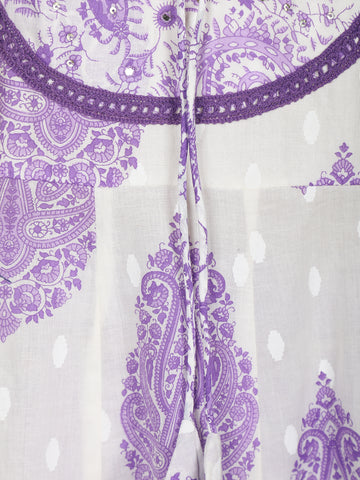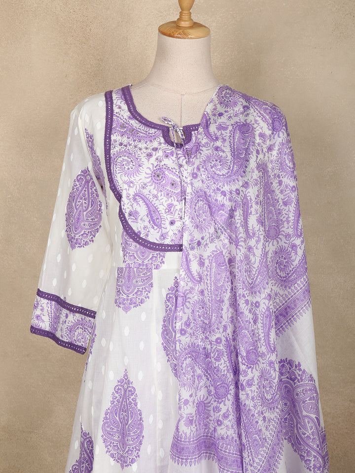 Elevate your everyday ethnic wardrobe with this refreshing white Anarkali suit adorned with elegant lavender paisley motifs. Crafted from breathable cotton fabric, it ensures all-day comfort while keeping your style effortlessly graceful.