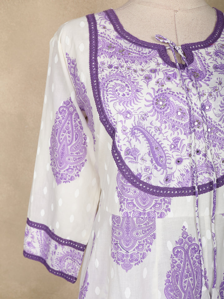 The yoke is beautifully accentuated with intricate paisley prints highlighted with a matching lavender border, adding a delicate charm to the neckline. The polka-dot patterned base blends seamlessly with the detailed paisley prints for a classy and contemporary appeal.