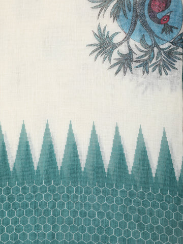 White Peacock Printed Linen Cotton Saree with Contrast Teal Border