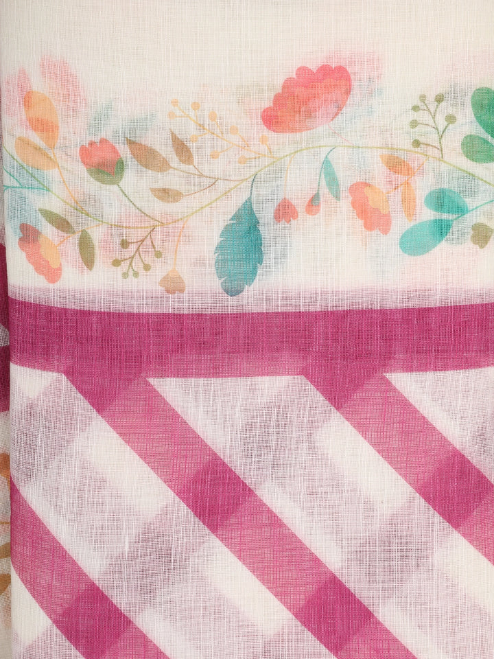White Pink Stripes Printed Linen Cotton Saree with Floral Border