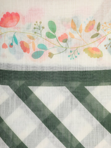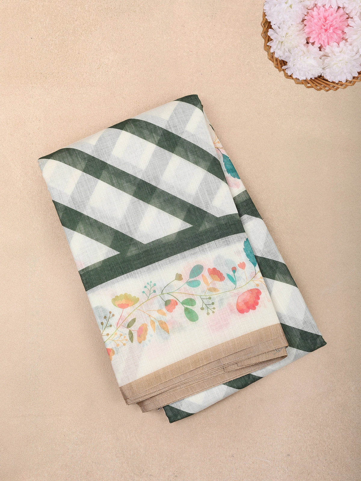 White Stripes and Floral Printed Linen Cotton Saree with Border