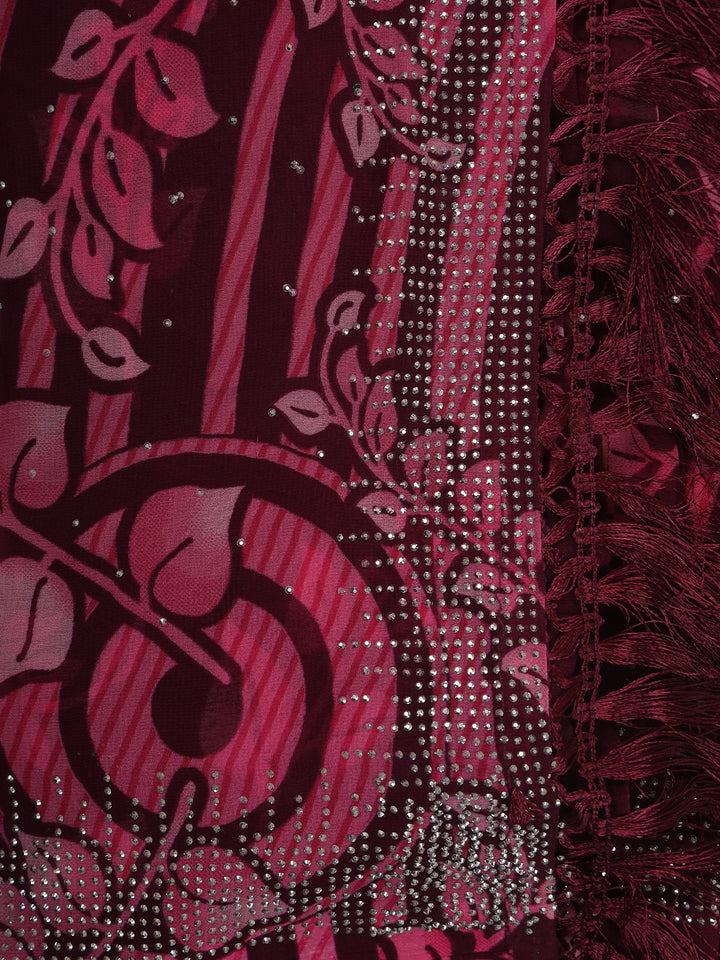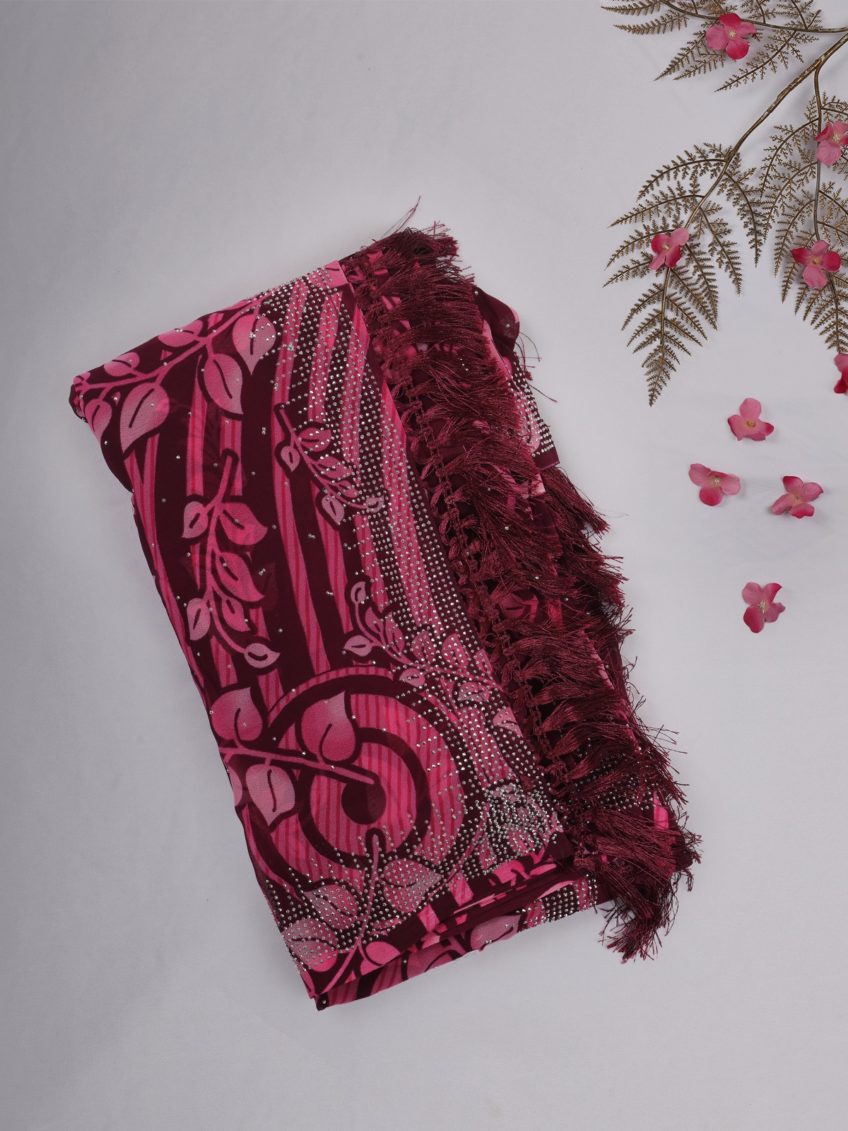 Wine and Pink Floral Printed Design Chiffon Saree with Stone Embellished Border