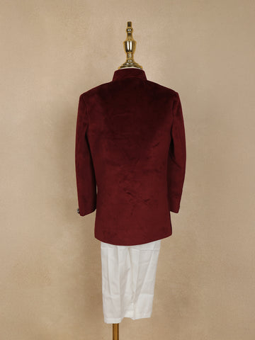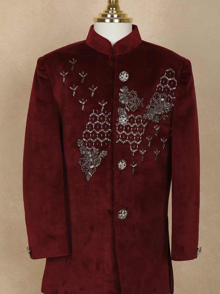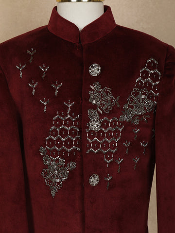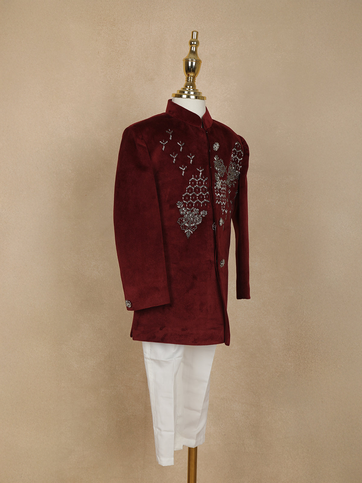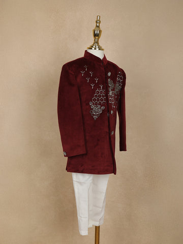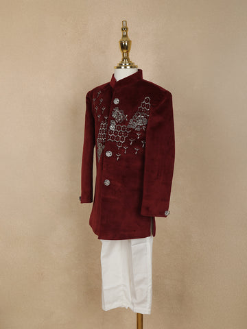 Wine Beads Embroidered Kids Velvet Sherwani Set with White Pant