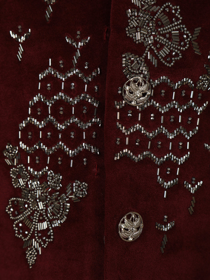 Dress your young gentleman in pure elegance with this maroon velvet sherwani set, crafted for grand celebrations and traditional occasions. The luxurious velvet fabric brings a royal feel, while the striking bead and sequin embroidery adds a sophisticated shimmer across the front. Designed with a smart mandarin collar and ornate metal buttons, this outfit combines classic ethnic charm with modern styling.