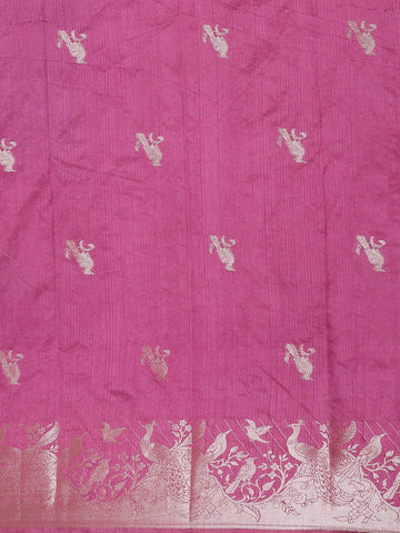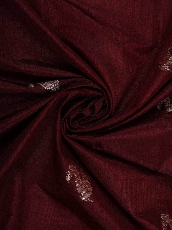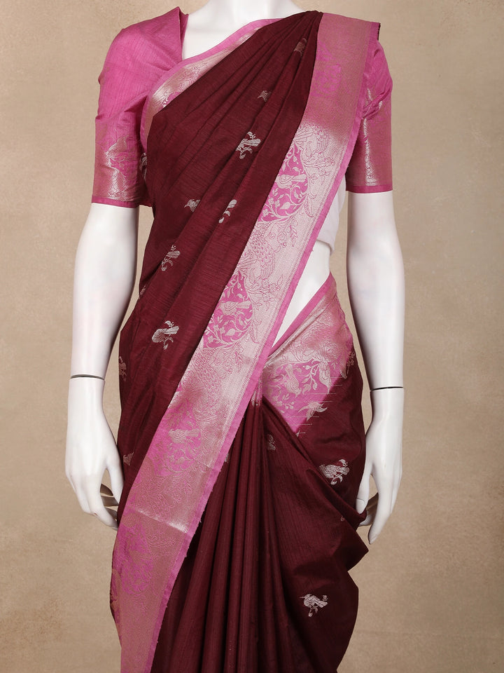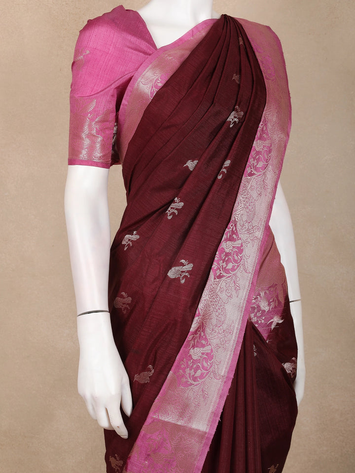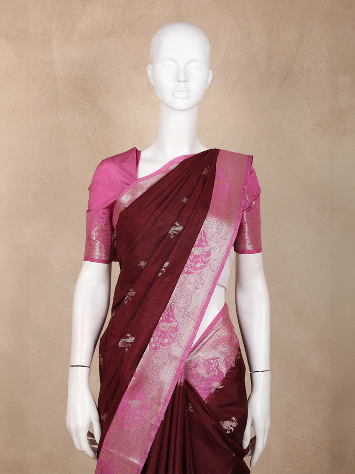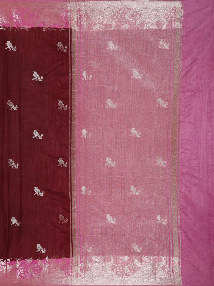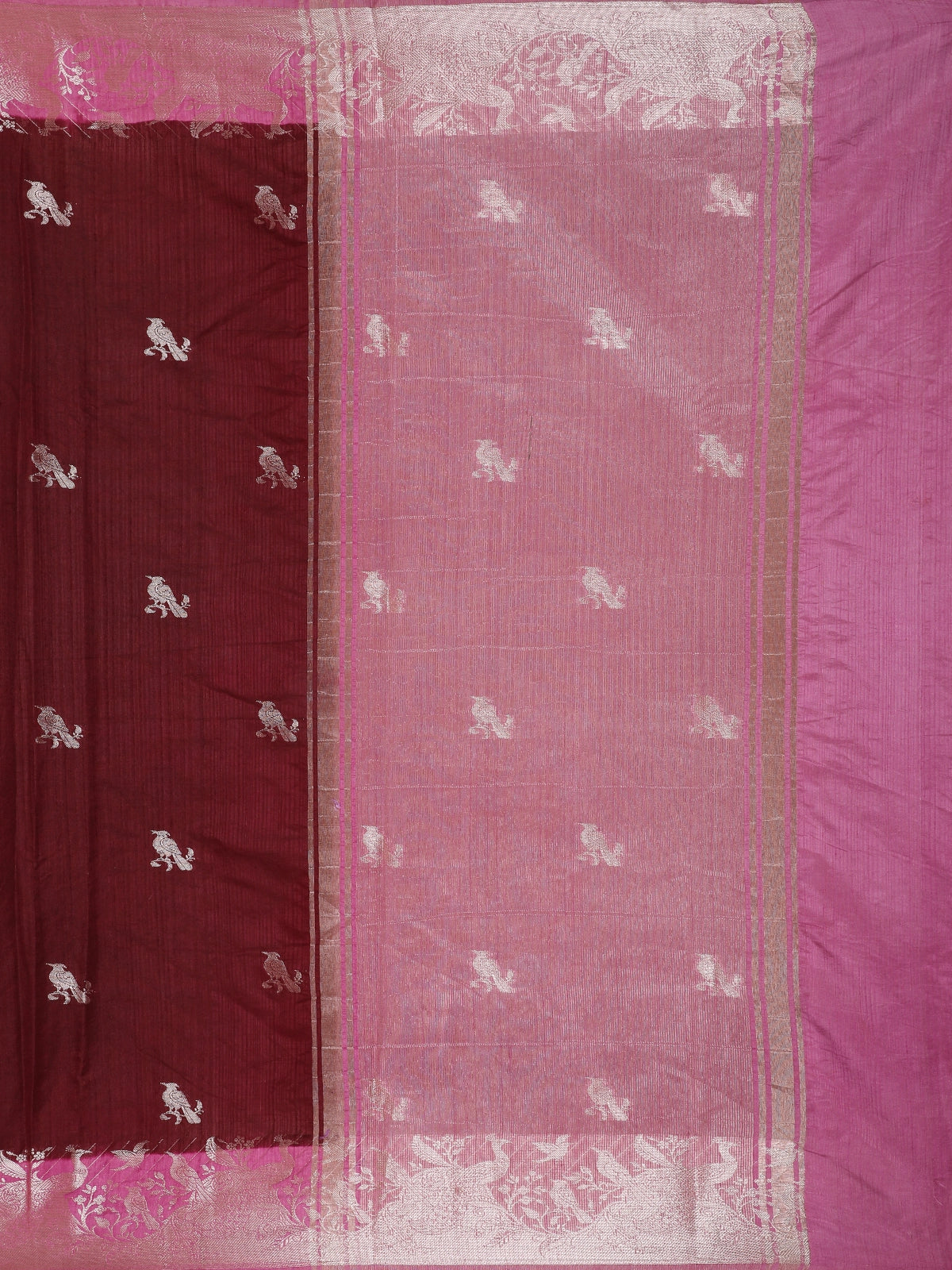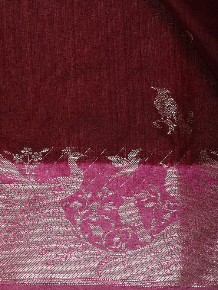 Wine Birds Woven Raw Silk Saree with Contrast Pink Zari Border