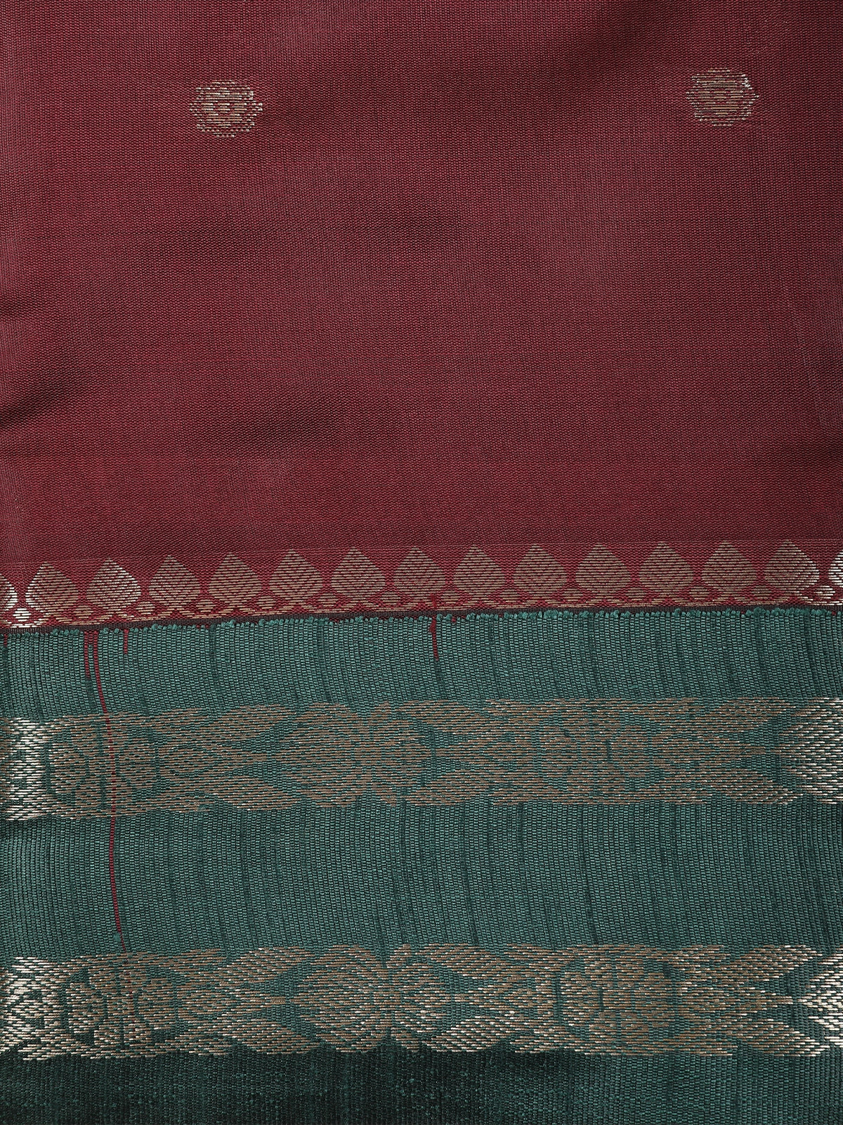 Adding a striking contrast, the saree is beautifully finished with a wine zari woven border, detailed with traditional floral patterns that enhance its festive charm. The soft silk fabric offers a smooth texture with a gentle sheen, ensuring a comfortable drape while maintaining an elegant silhouette.
