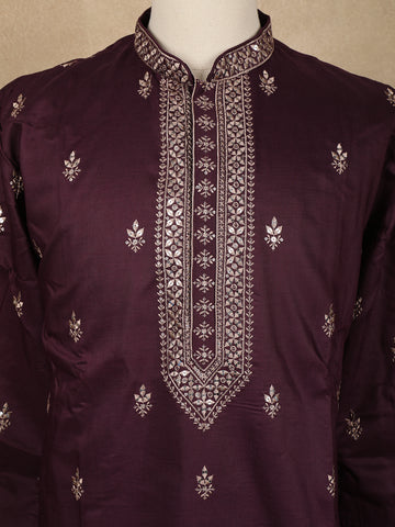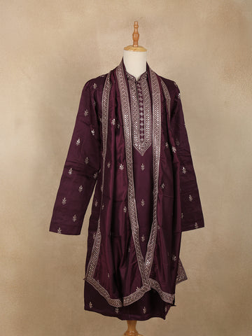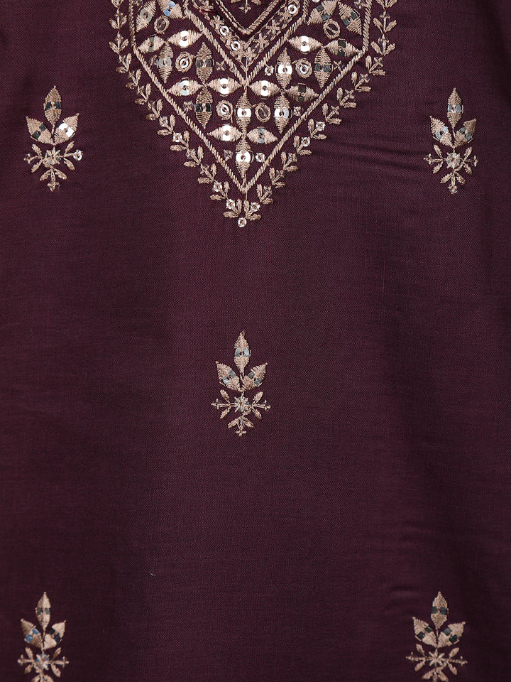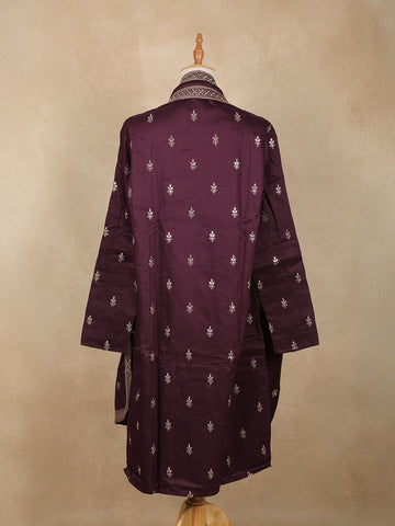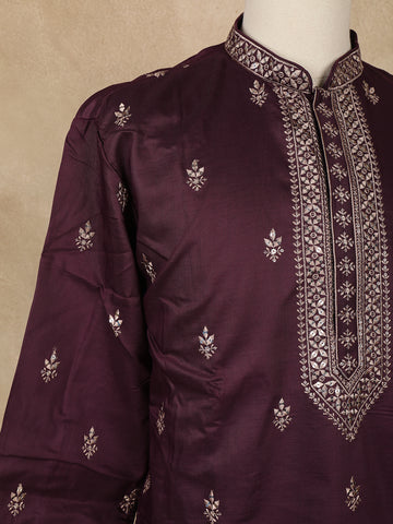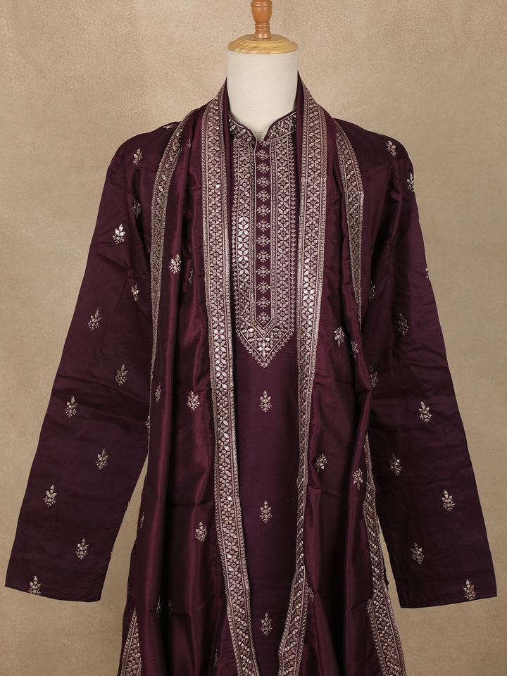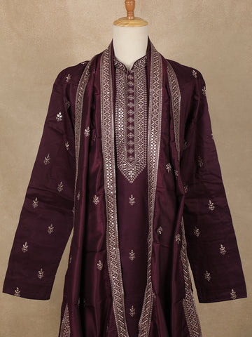 Wine Embroidered Design Semi Silk Kurta With Dupatta