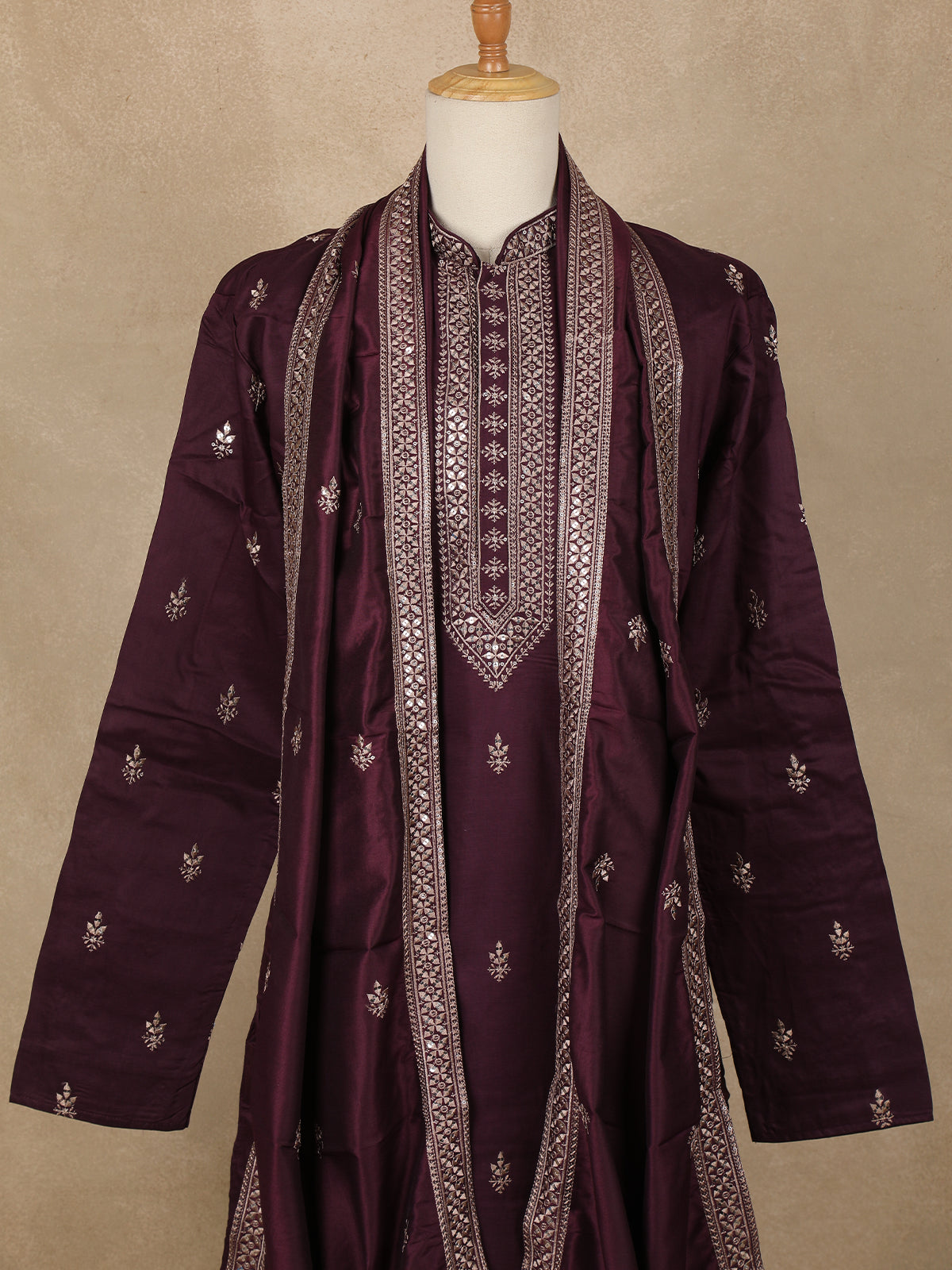 Radiate regal elegance with this Wine Embroidered Design Semi Silk Kurta with Dupatta, a perfect blend of traditional charm and refined craftsmanship. The deep wine shade exudes sophistication, while the subtle shimmer of the semi-silk fabric adds a luxurious touch to every occasion.