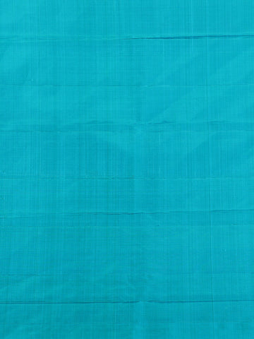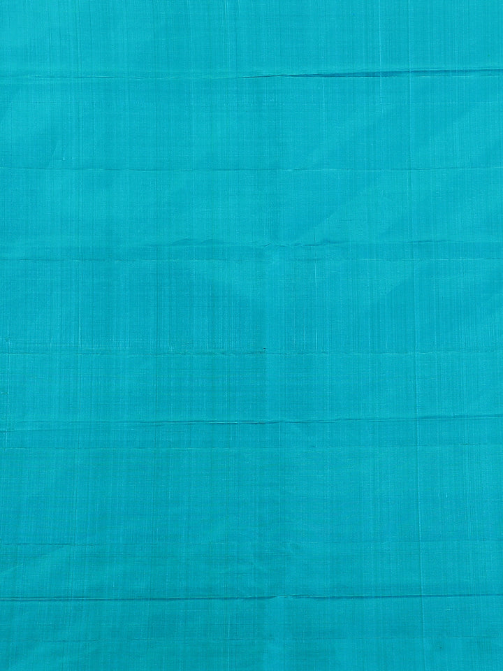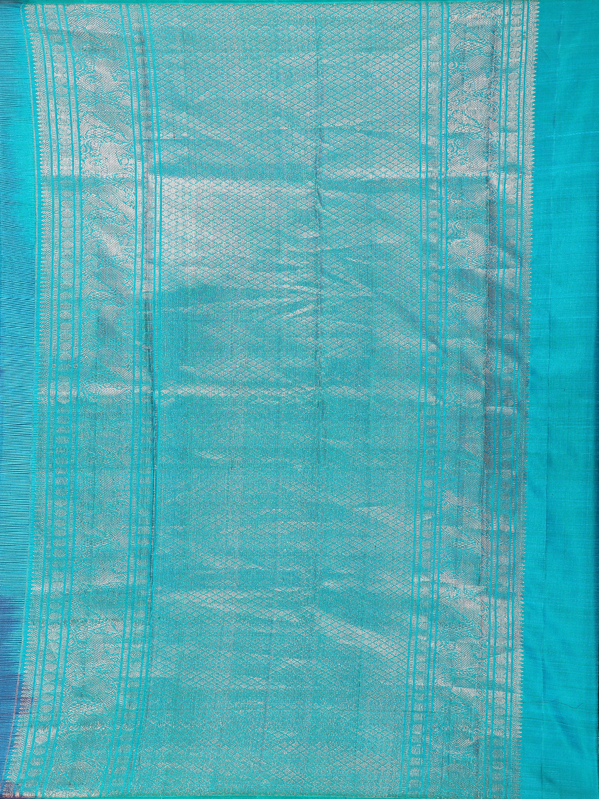 The saree features refined striped weaving on the pleats and border area, enhancing its heritage texture with a graceful aesthetic. Paired with a contrasting teal silk blouse, this ensemble brings out a luxurious and celebratory appeal — perfect for temple ceremonies, weddings, and festive occasions.