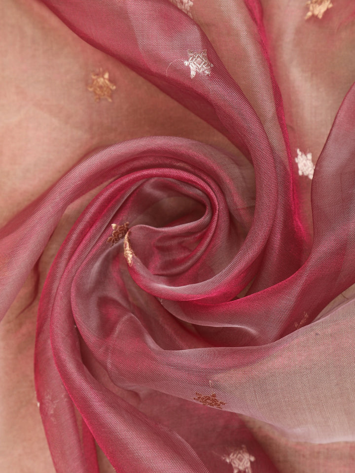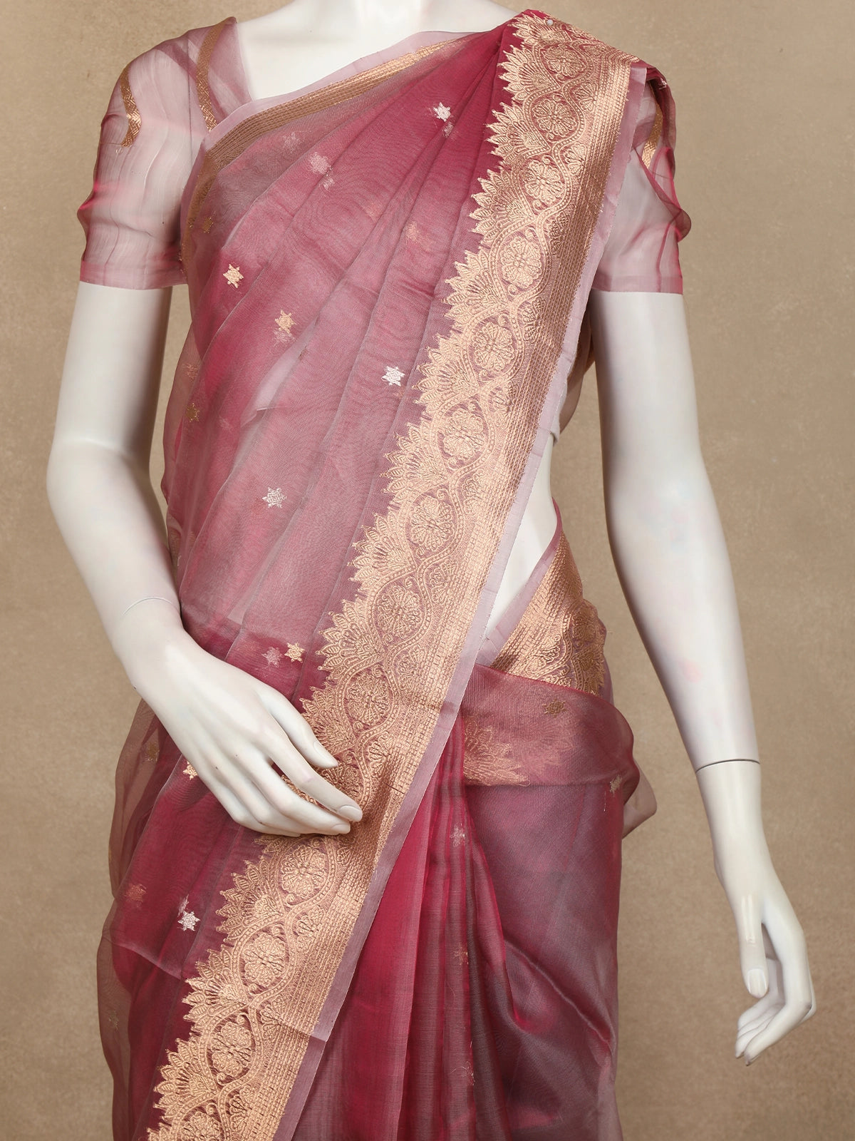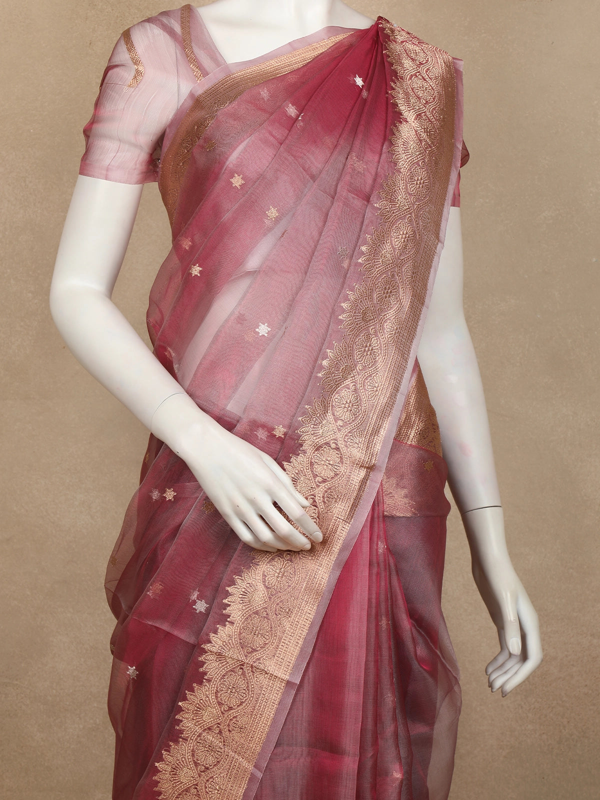 Add a stunning touch of grace to your ethnic look with this exquisite Wine Tissue Saree. The sheer, glossy texture of tissue silk blends beautifully with intricately woven floral butta motifs spread across the body, giving a subtle luxurious shimmer. The saree is elevated with a beautifully crafted designer zari border that highlights the drape, making it perfect for weddings and special celebrations. The matching pallu with vertical zari stripes enhances the fine craftsmanship while keeping the saree lightweight and comfortable to carry all day. An elegant choice for bridesmaids, festive occasions and traditional gatherings.