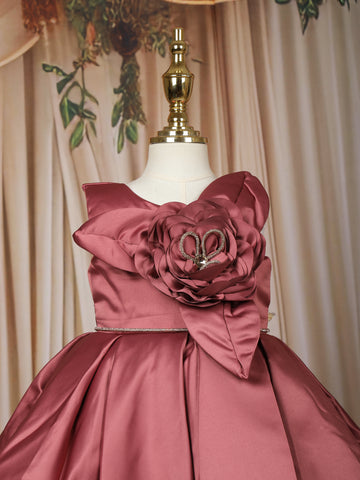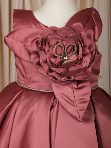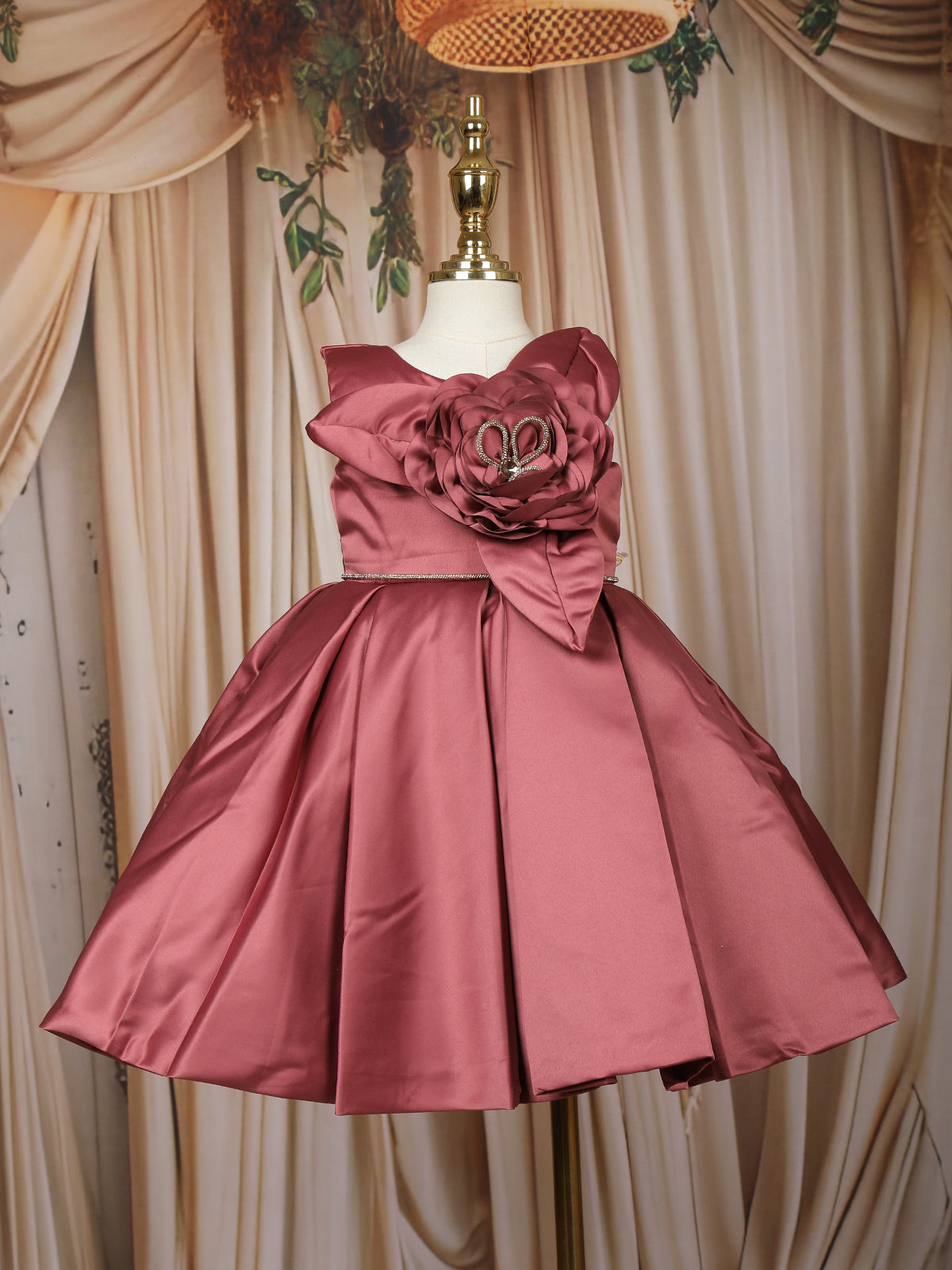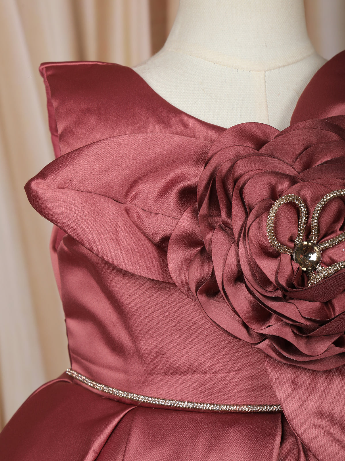 Make your little princess dazzle in timeless elegance with this Wine Satin Party Frock, a masterpiece that blends luxury and grace. Crafted from premium satin fabric, this frock features a brilliant sheen and structured flared silhouette that gives it a royal charm. The highlight of the design is the oversized 3D floral appliqué on the bodice, artistically layered with satin petals and accentuated with sparkling stone embellishments, adding a touch of glamour and sophistication.