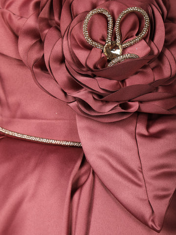 Wine Floral Design Satin Party Frock With Oversized Floral Appliqué