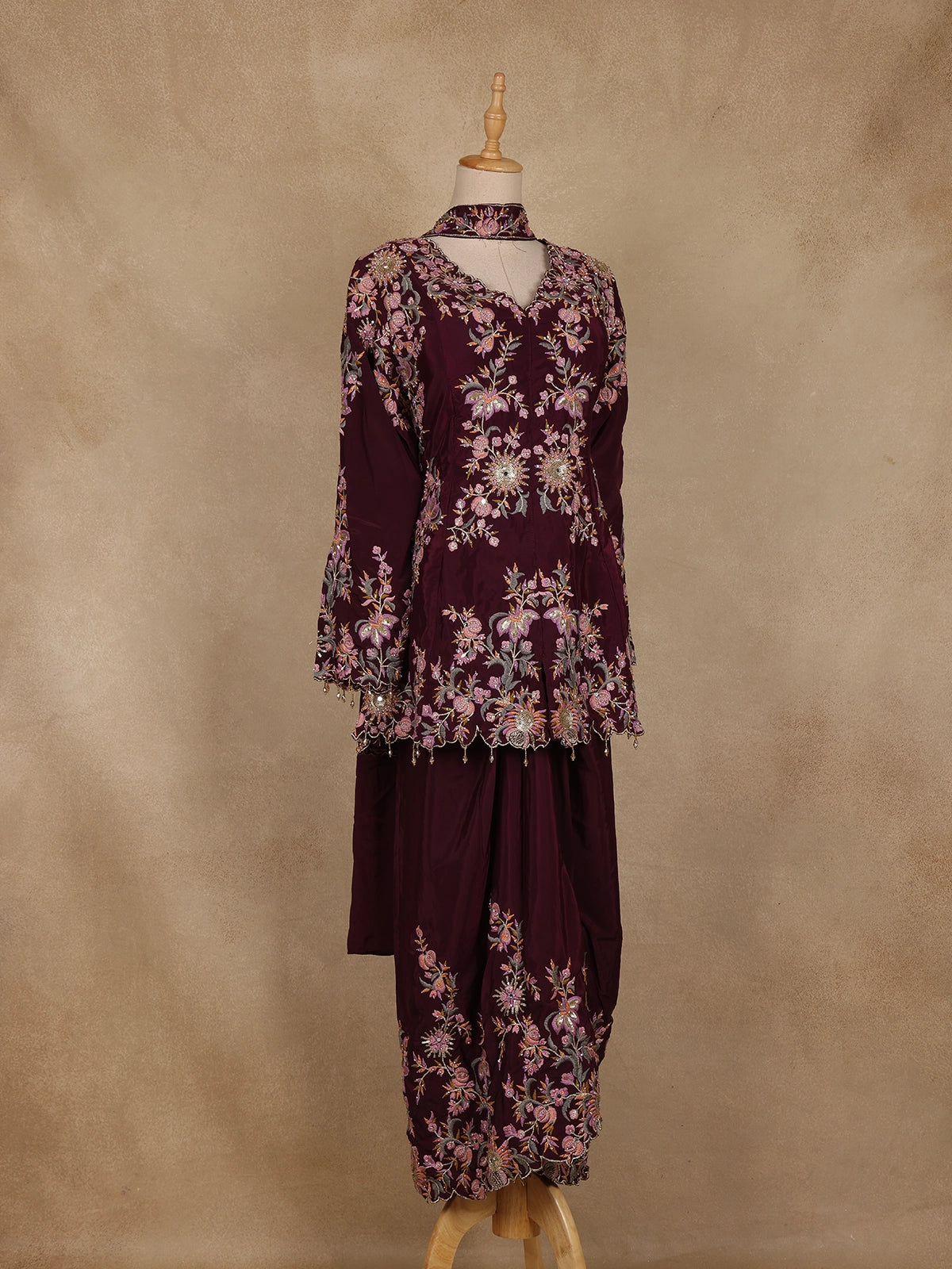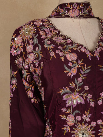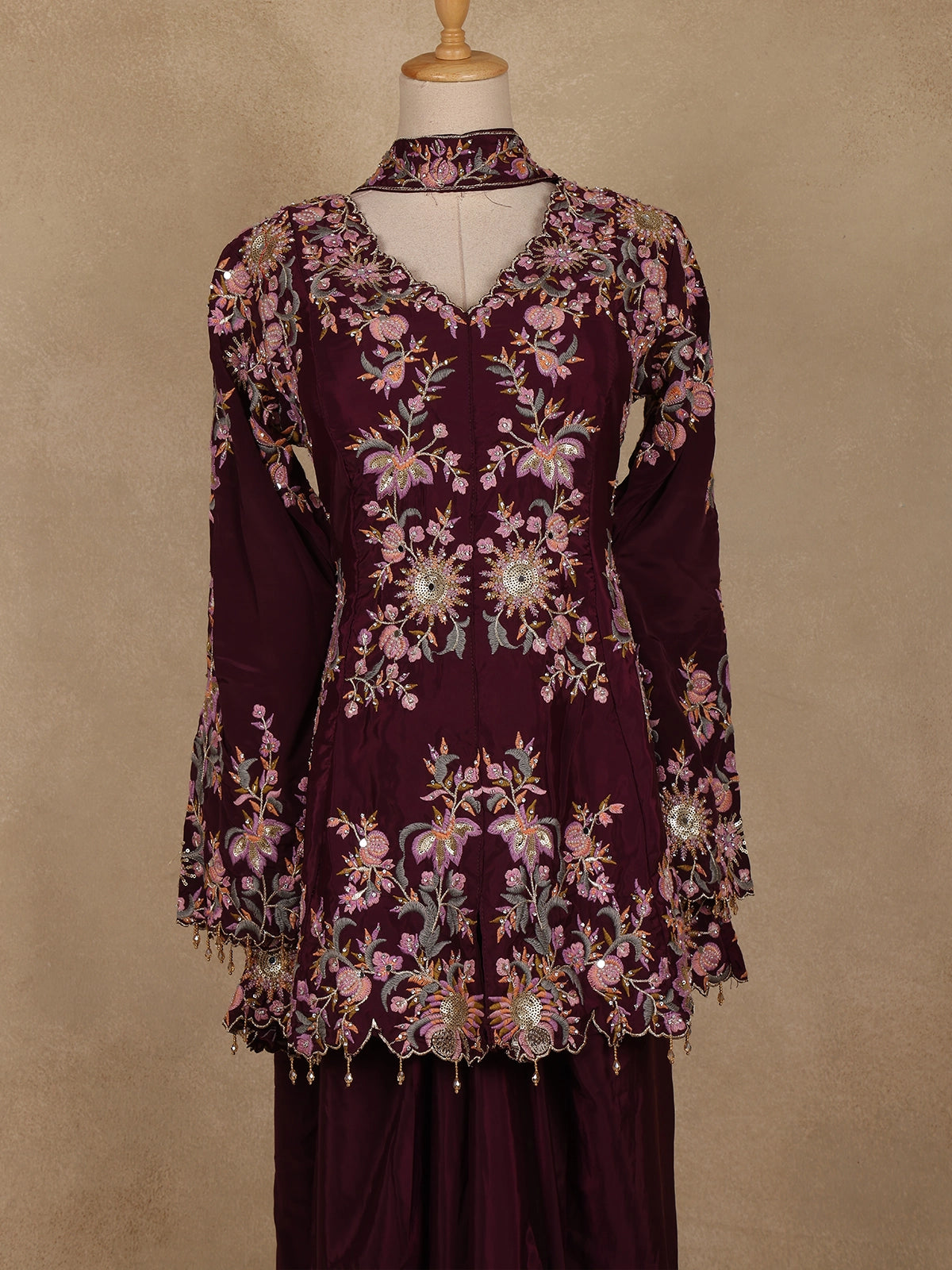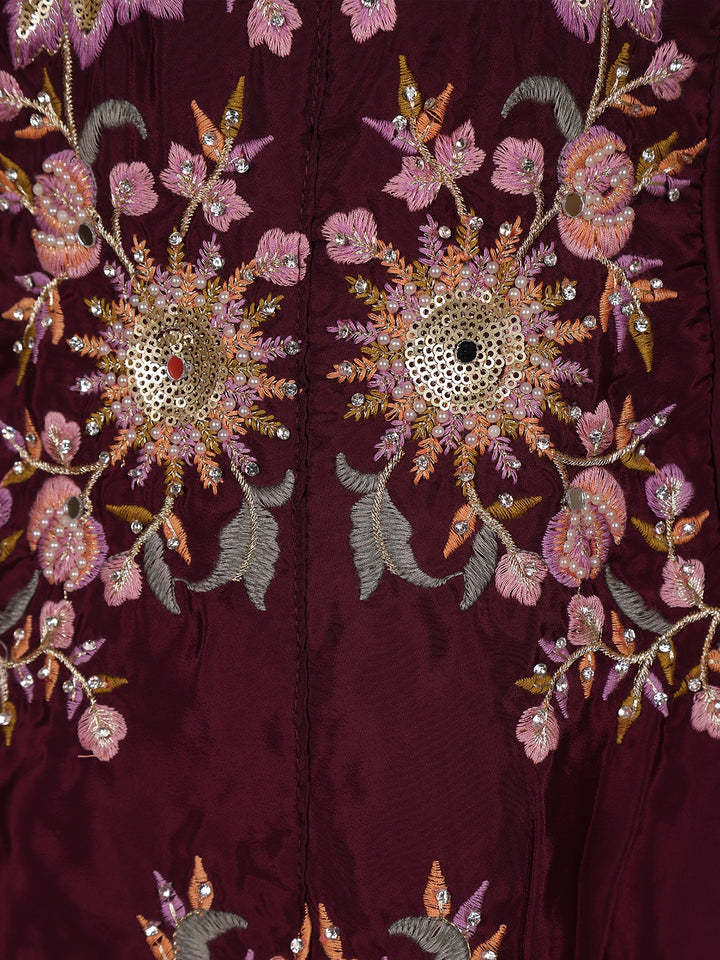 Wine Floral Embroidered Crepe Silk Skirt Top