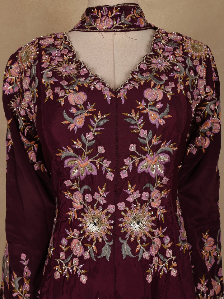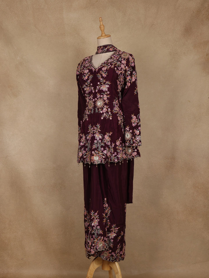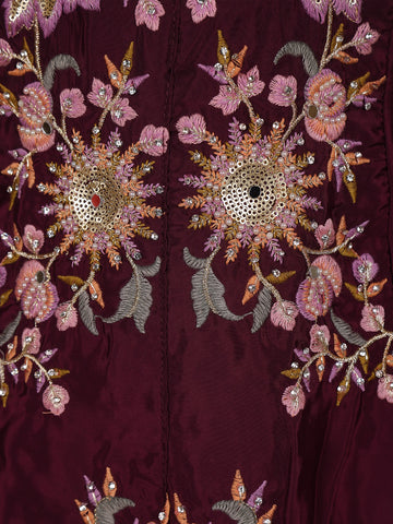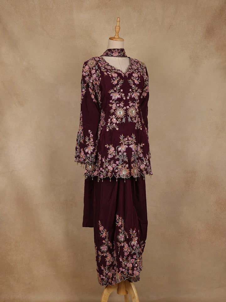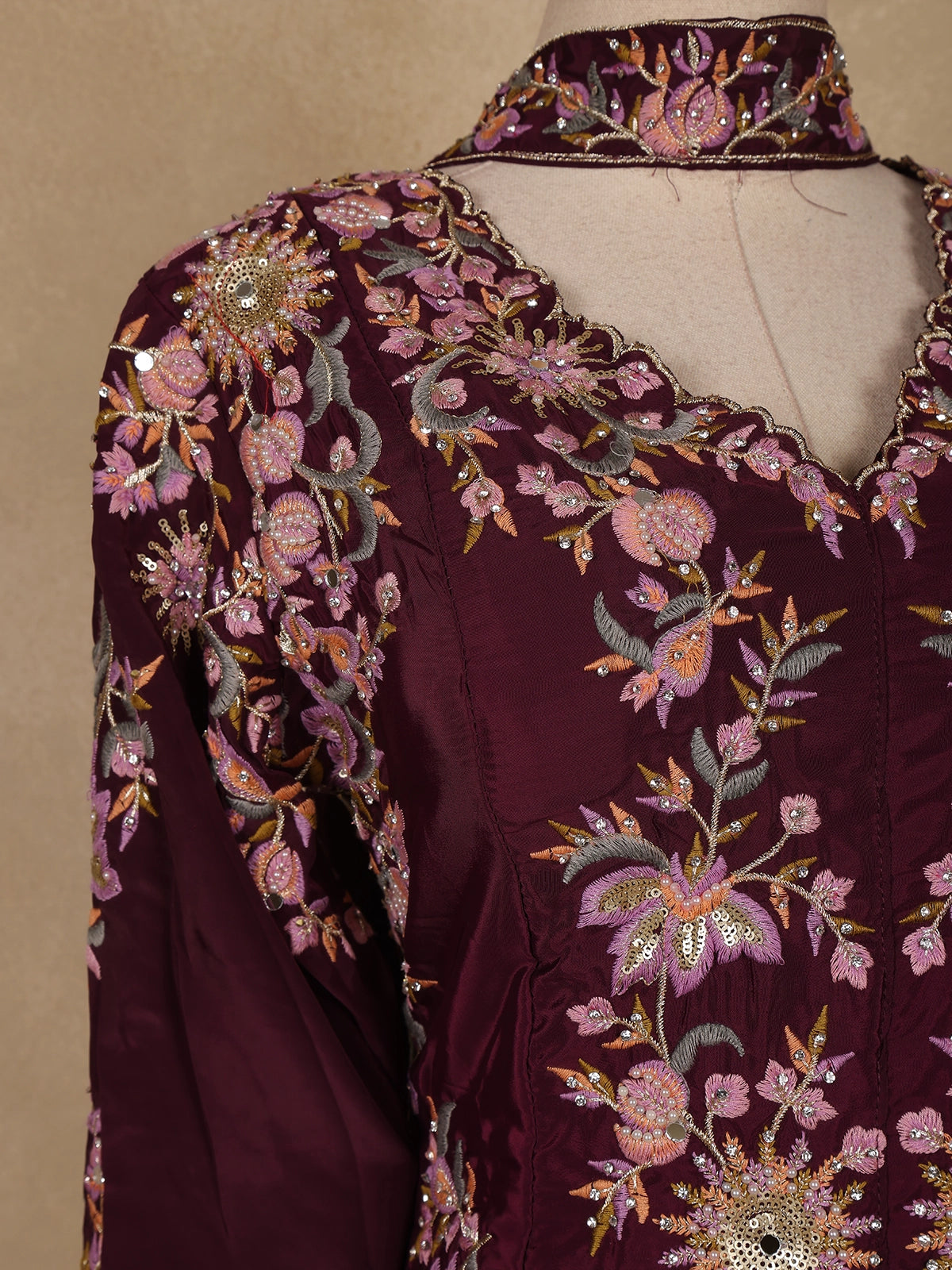 Radiate elegance in this Wine Floral Embroidered Crepe Silk Skirt Top Set, designed to make every occasion special. The ensemble features a luxurious crepe silk fabric that drapes beautifully, offering a graceful and comfortable fit. The V-neckline adds a touch of modern sophistication, while the full sleeves enhance the refined charm of the outfit.