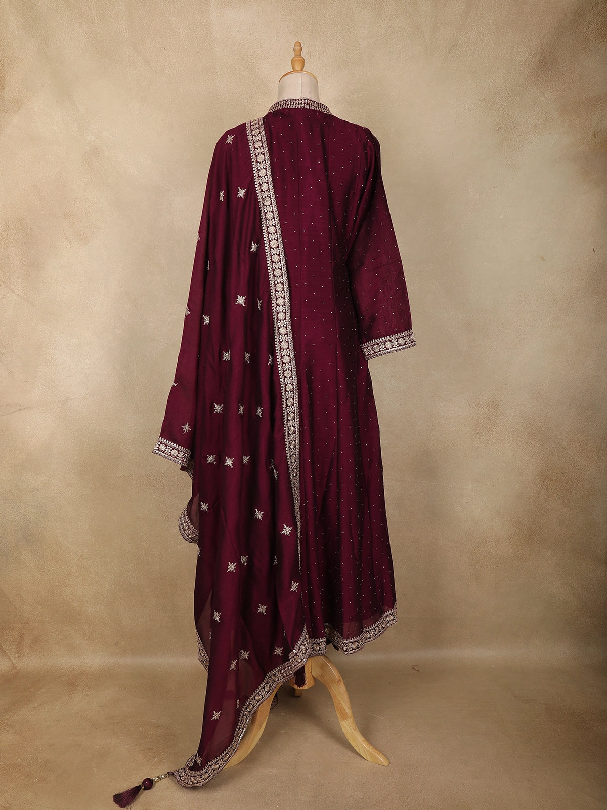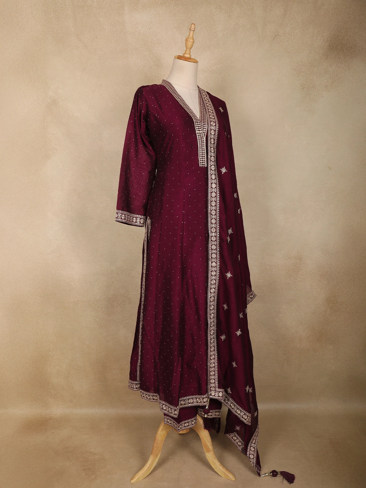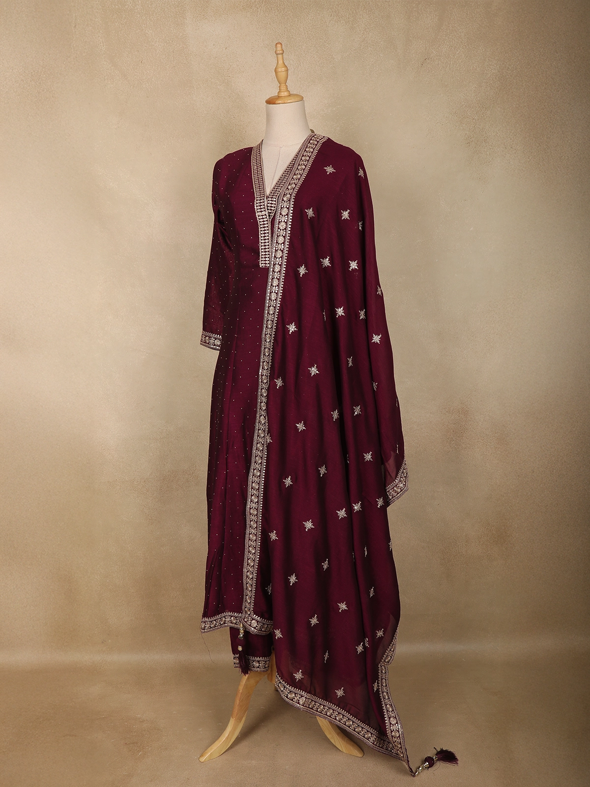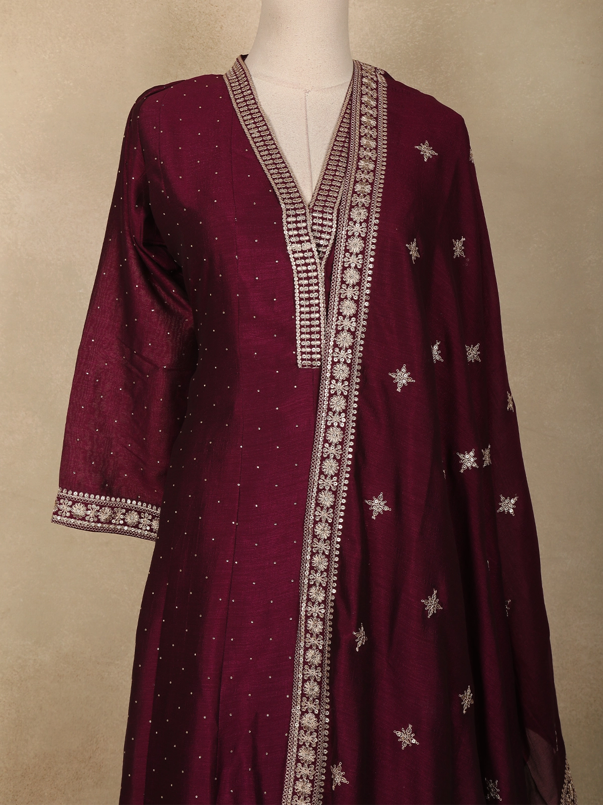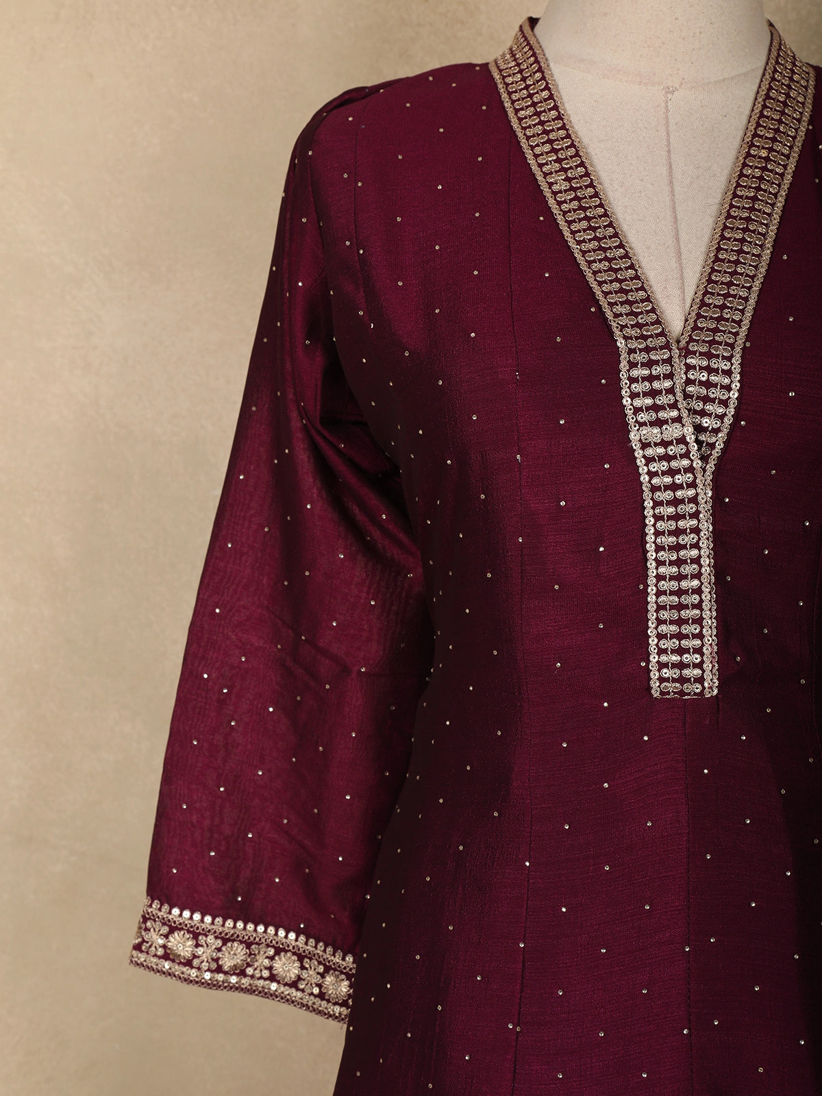Exuding graceful elegance, this wine straight cut salwar suit is crafted in a lightweight georgette fabric that drapes beautifully and offers all-day comfort. The kurta is adorned with delicate floral embroidery arranged in a subtle all-over pattern, enhanced with fine zari and sequin detailing that adds a refined festive glow. The V-shaped neckline is highlighted with an intricately embroidered placket, lending a polished and sophisticated finish.