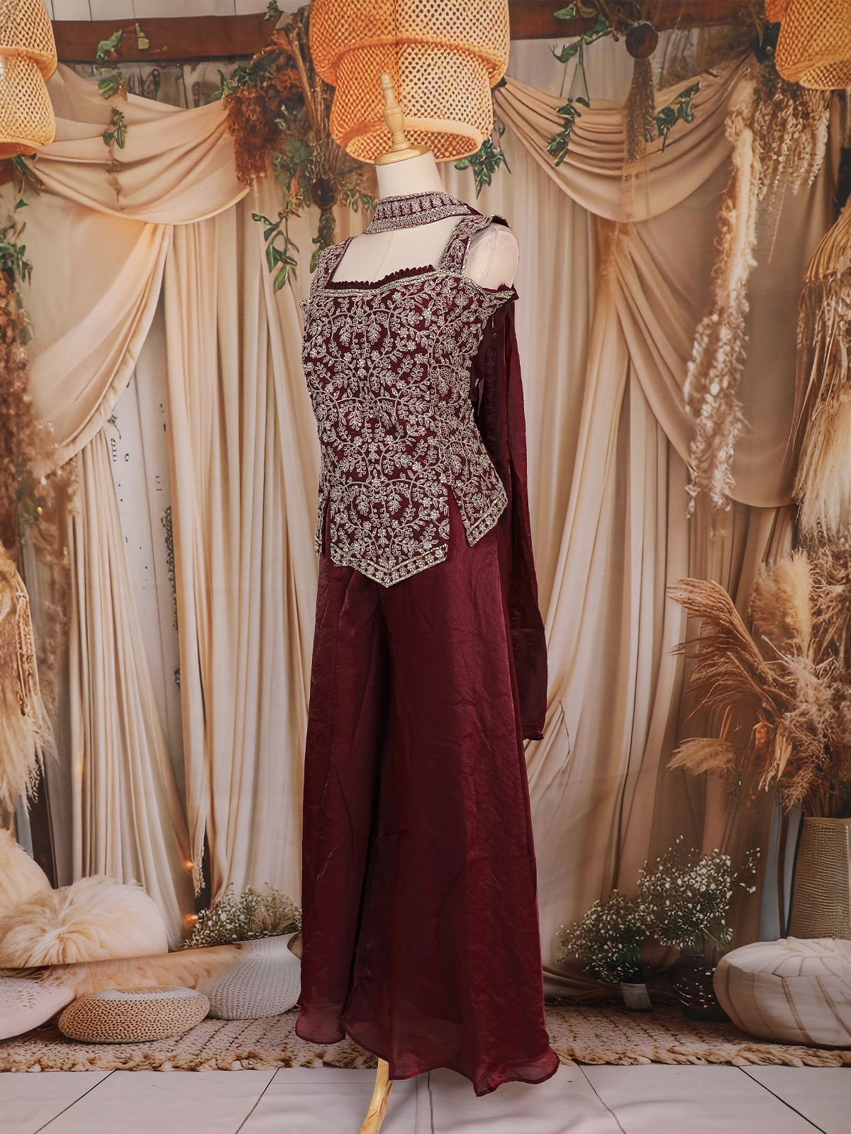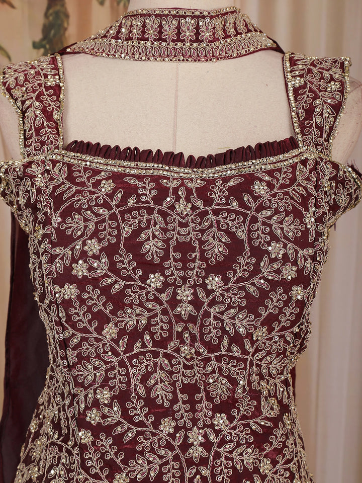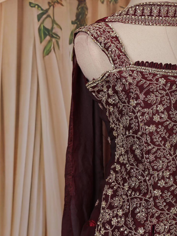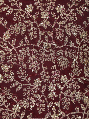 Wine Floral Embroidered Design Organza Palazzo Suit