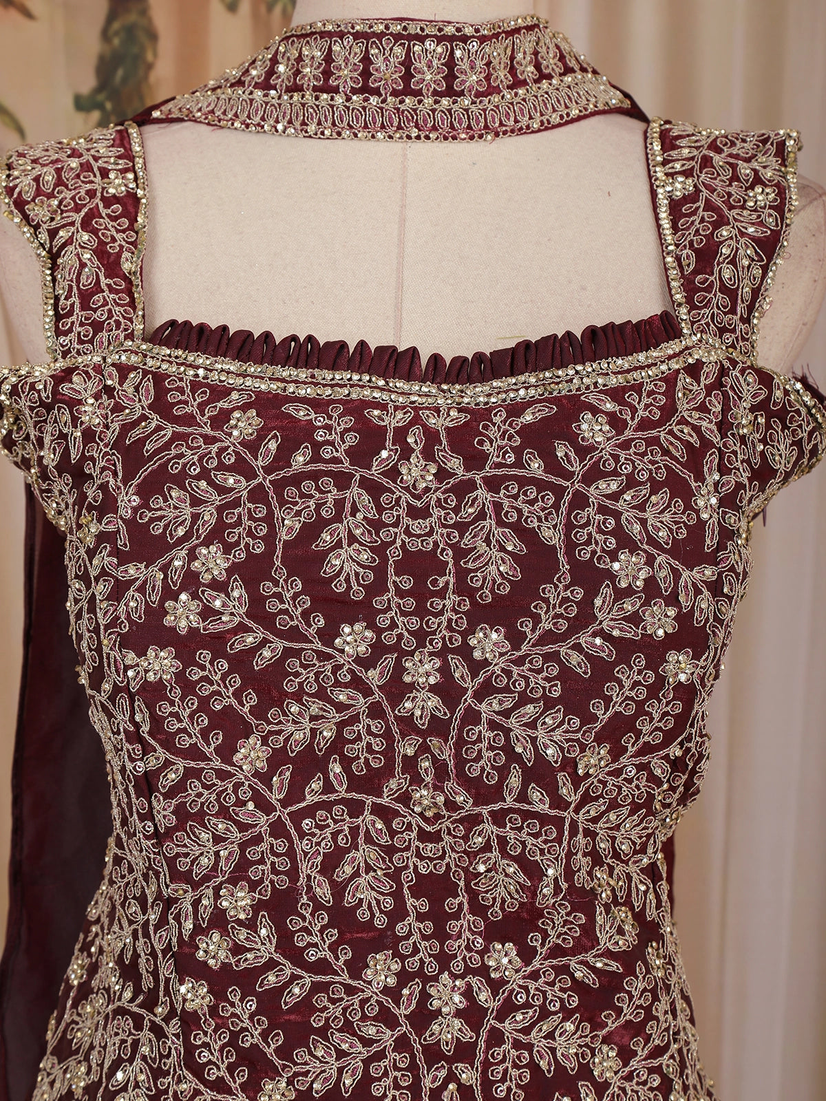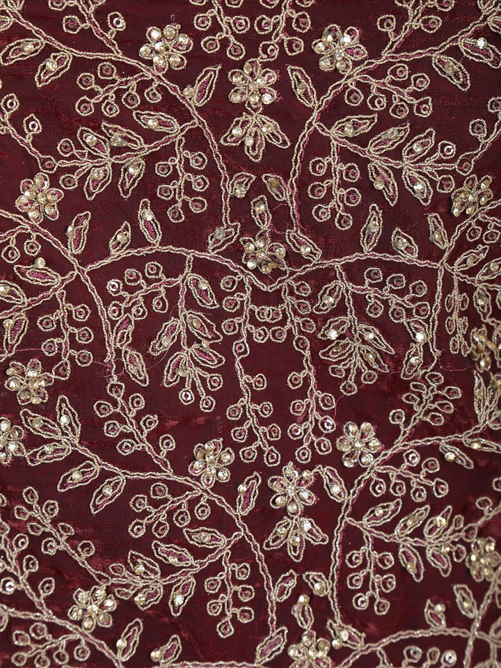 Embrace sheer elegance with this Wine Floral Embroidered Organza Palazzo Suit, a captivating ensemble designed to elevate your festive and special-occasion wardrobe. The outfit features a sleeveless square-neck kurta beautifully enriched with floral embroidery, showcasing a meticulous blend of zari, thread, and sequin detailing that adds a touch of regal shimmer to the rich red base.