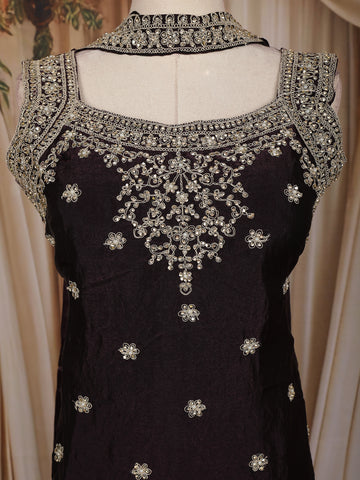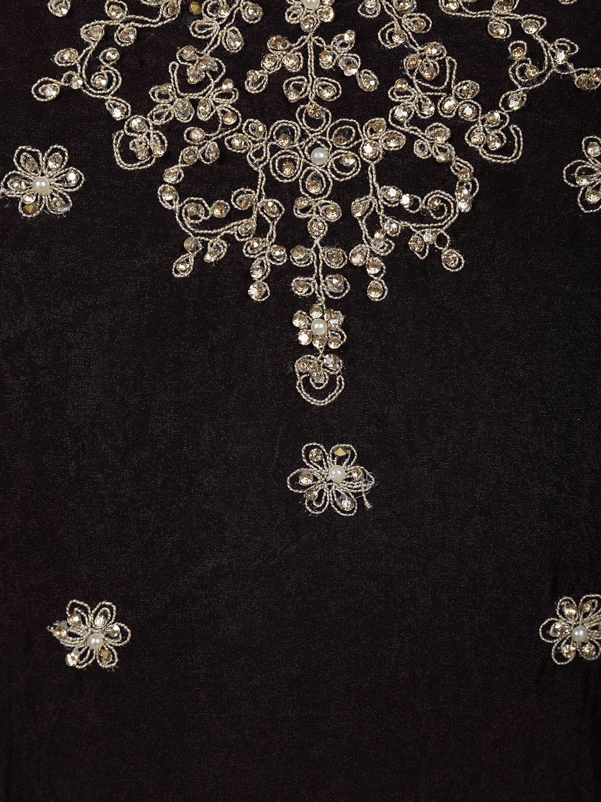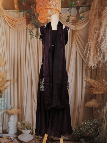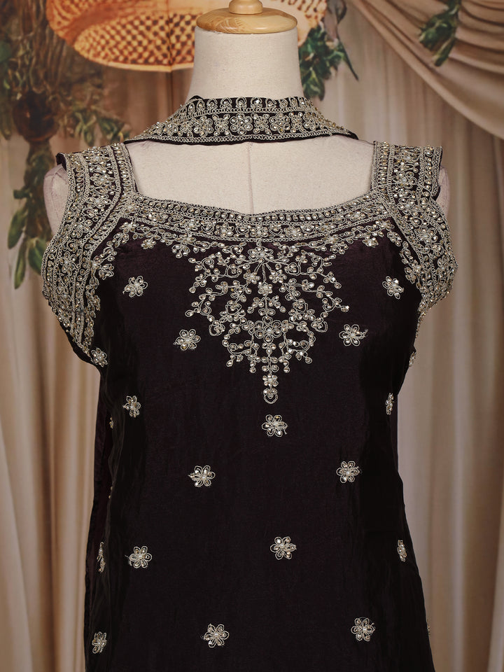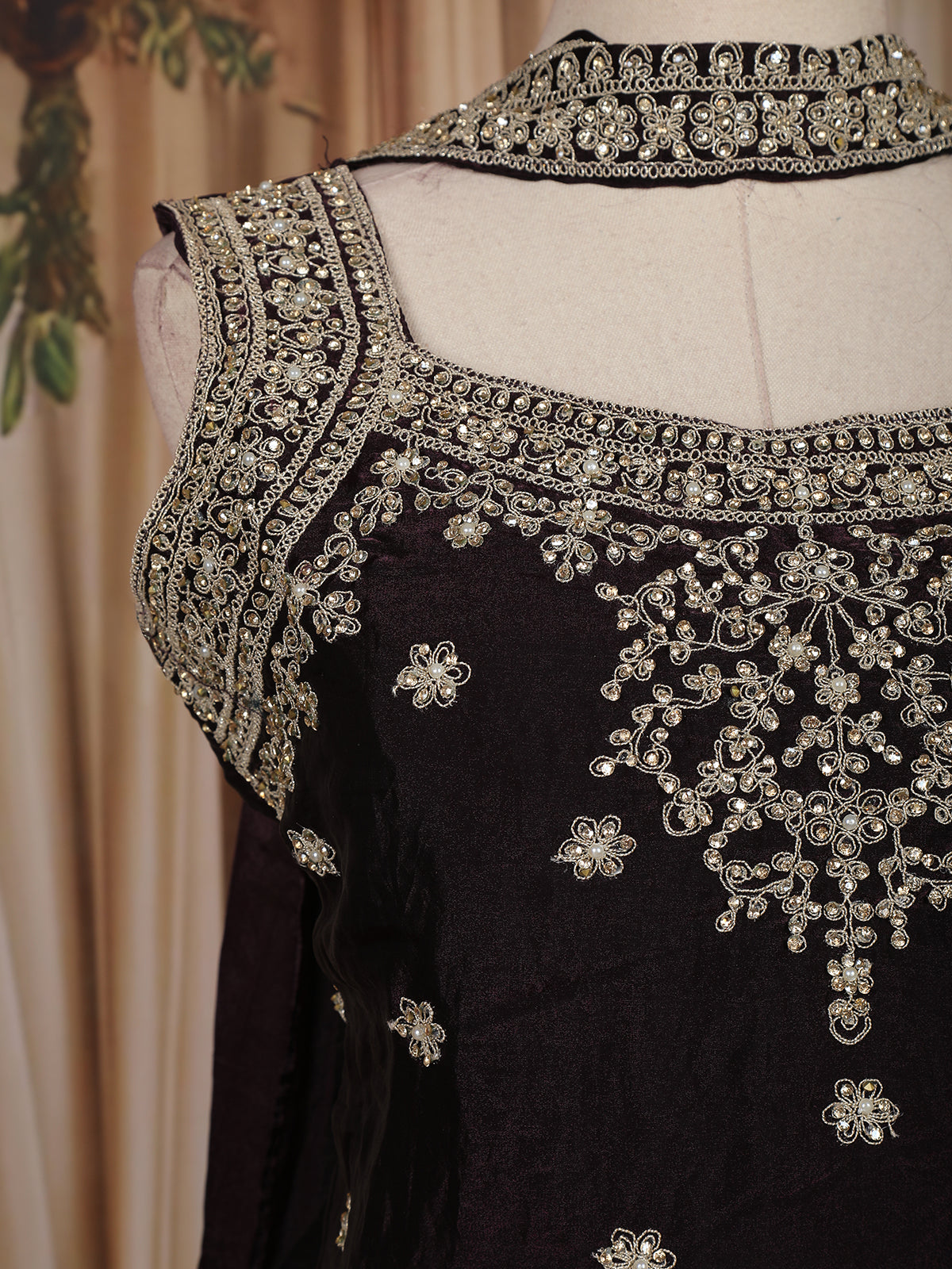 Add a touch of regal elegance to your festive wardrobe with this Wine Floral Embroidered Organza Palazzo Suit, an ensemble that perfectly blends grace and grandeur. The sheer organza fabric lends a luxurious sheen, beautifully adorned with floral embroidery in delicate thread and shimmering sequin highlights that enhance the deep wine hue with subtle radiance.