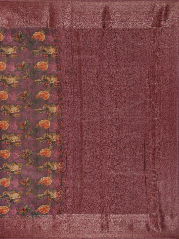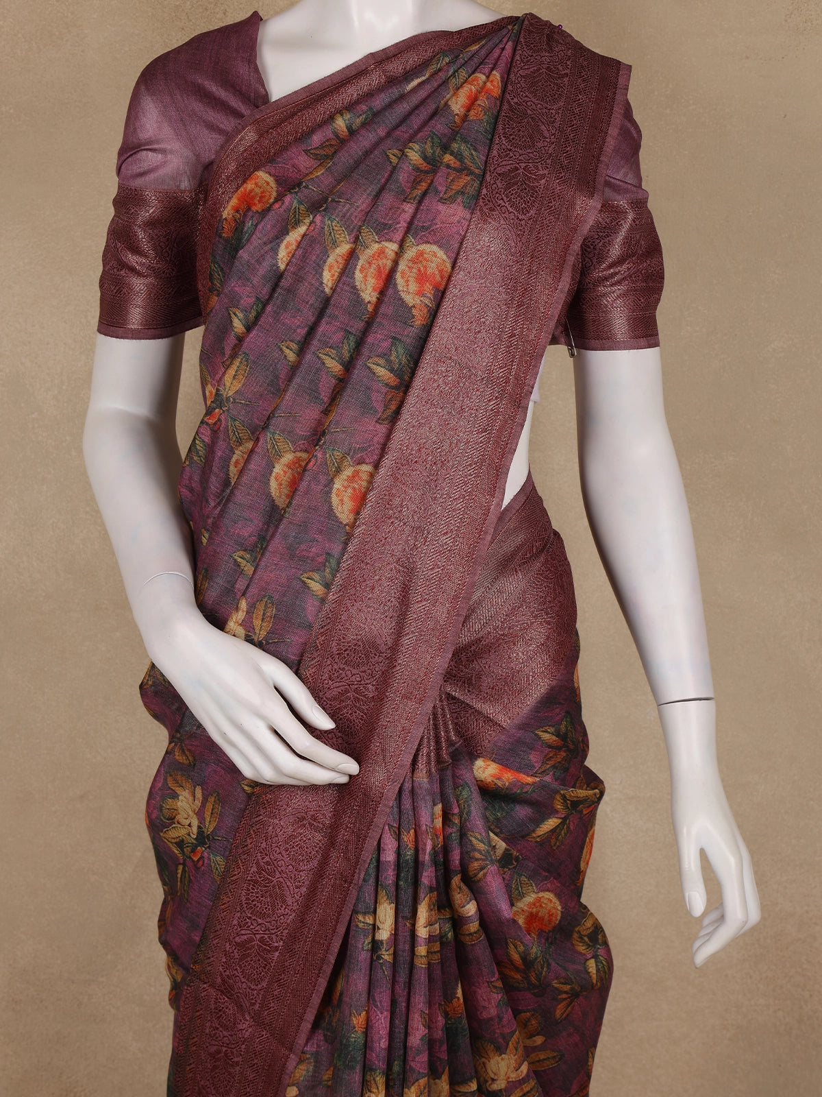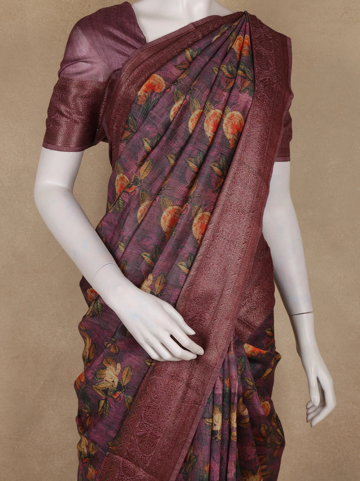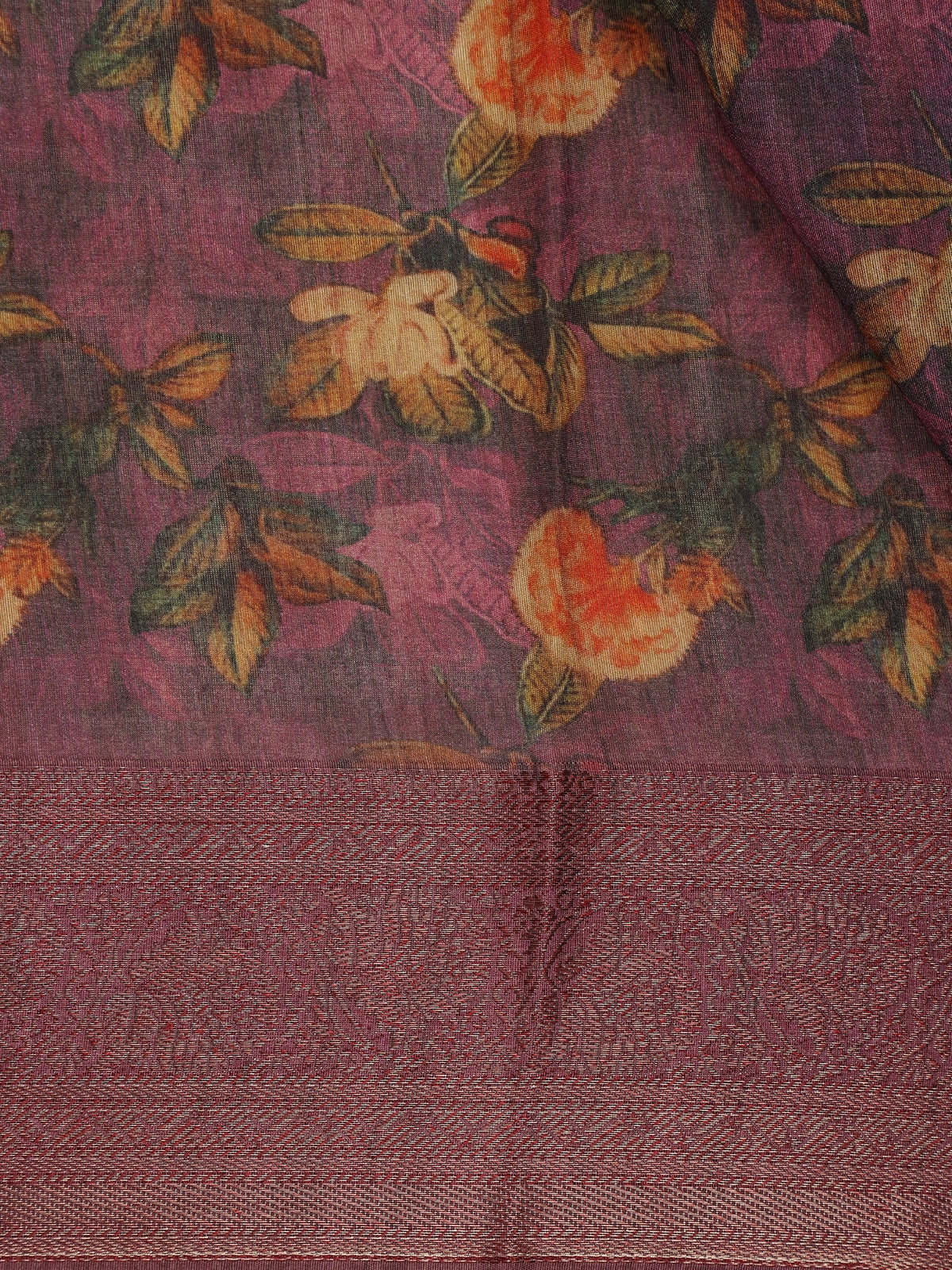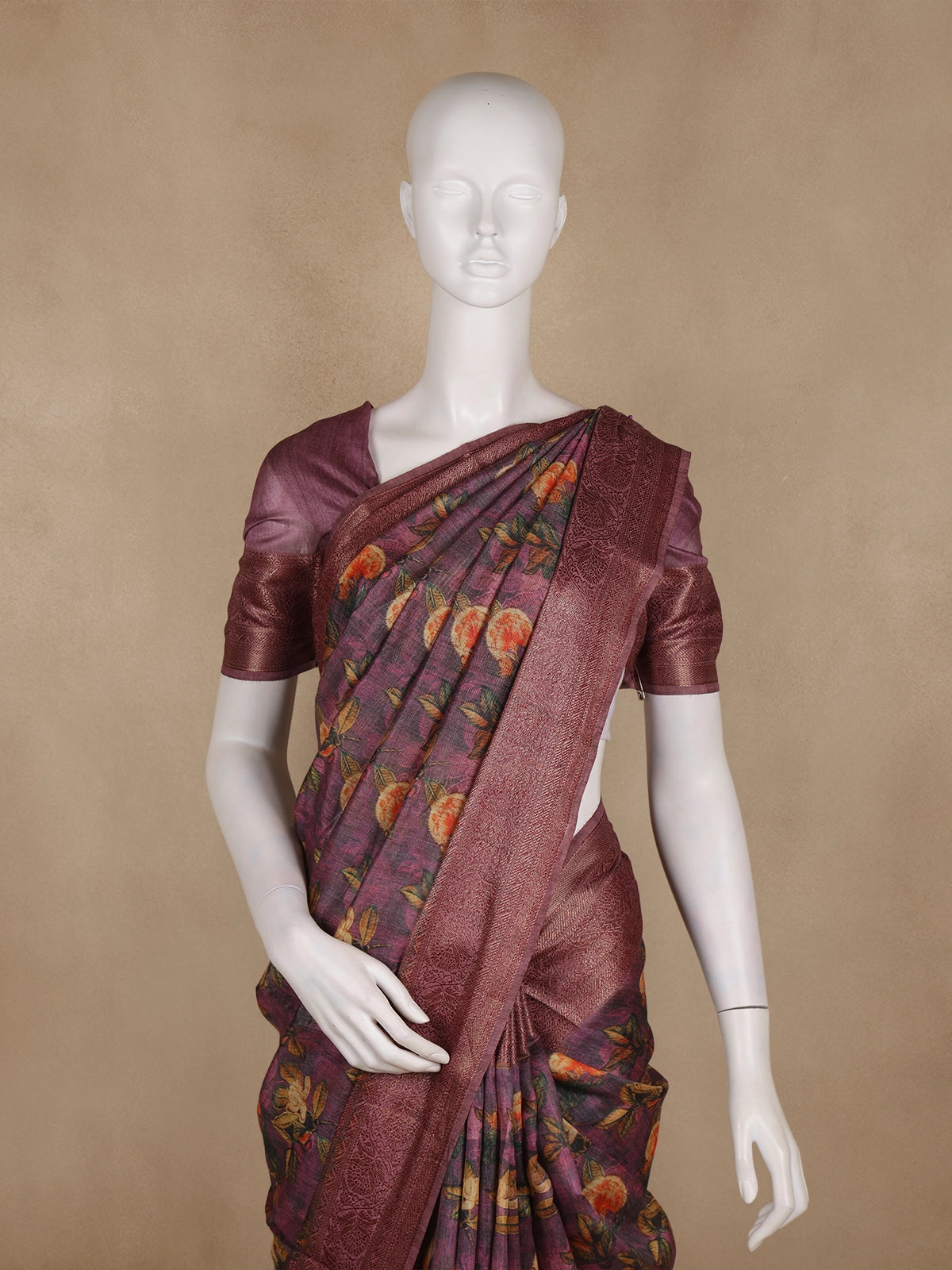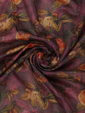 A stunning ode to grace and tradition, this Wine Floral Printed Chandheri Cotton Saree blends soft textures with exquisite artistry. The saree features vivid floral prints in hues of peach, yellow, and green set against a deep wine backdrop — a palette that radiates warmth and sophistication.