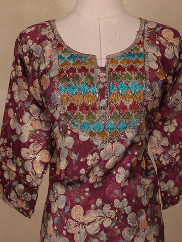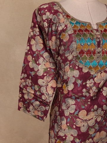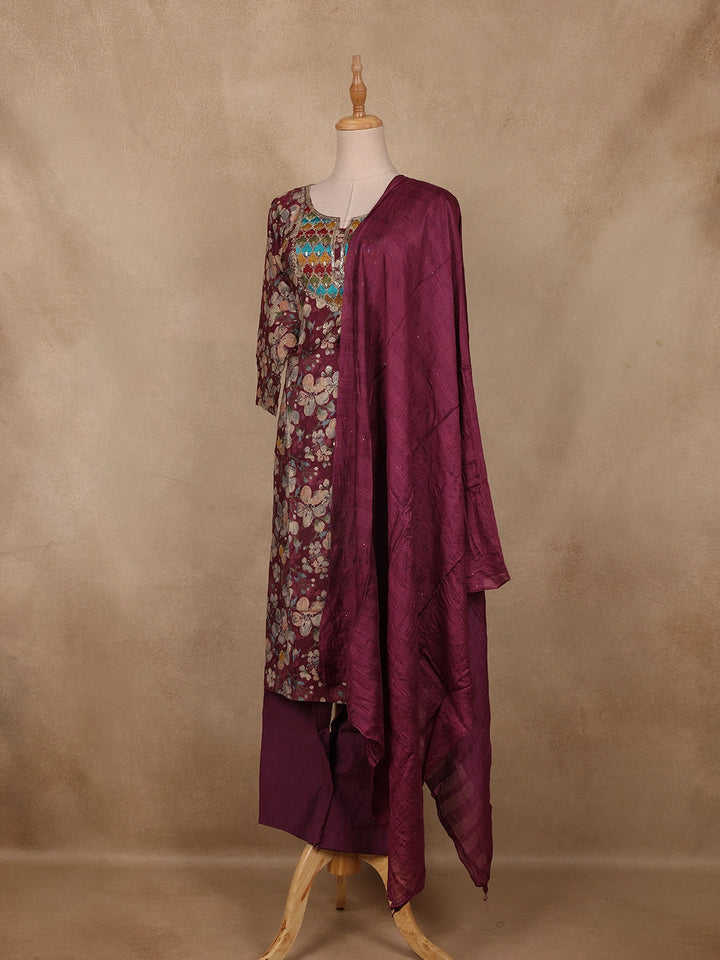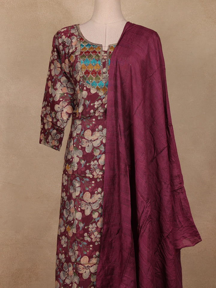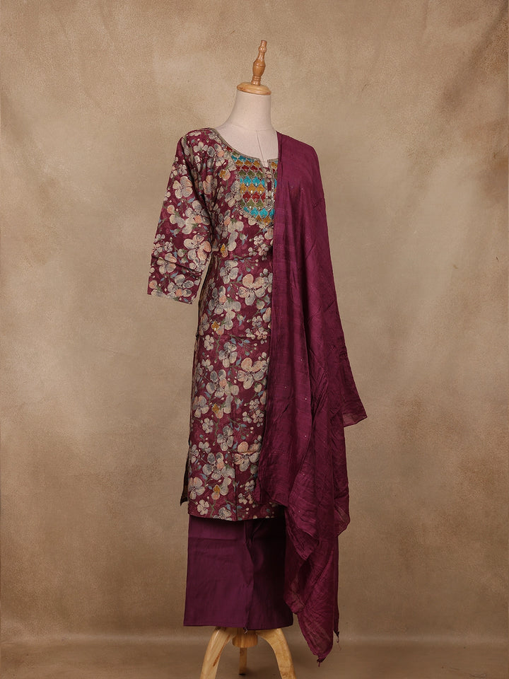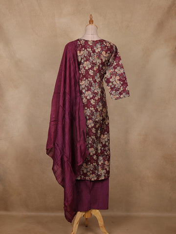 Wine Floral Printed Cotton Salwar Suit with Dupatta