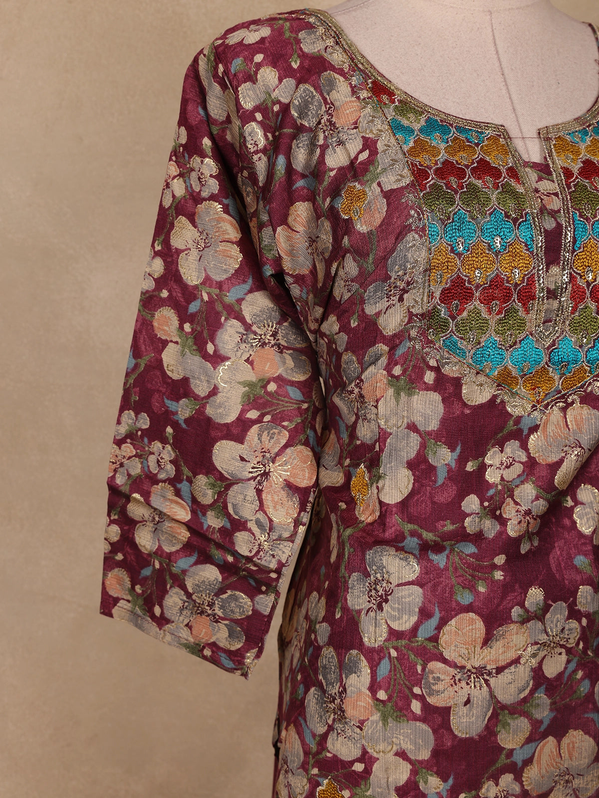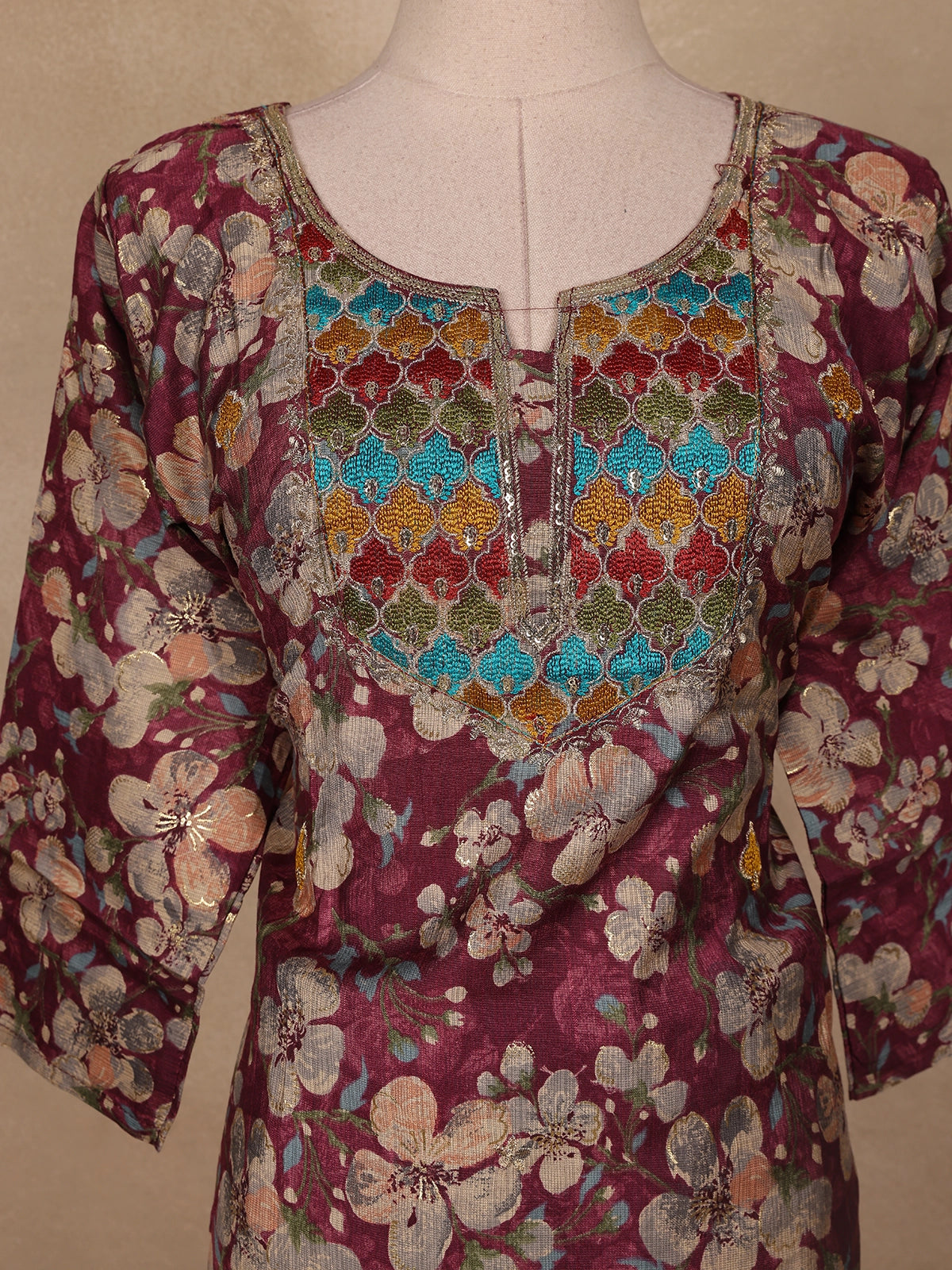 Elevate your ethnic charm with this Wine Floral Printed Cotton Salwar Suit, a perfect blend of grace and everyday comfort. The straight-cut kurta features a vibrant floral print in soft pastel tones, beautifully complemented by a geometric embroidered yoke that adds a refined traditional touch. Crafted from breathable cotton, this ensemble ensures comfort throughout the day. Paired with a matching cotton bottom and a solid wine-colored dupatta, it strikes the ideal balance between elegance and ease.