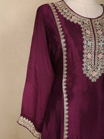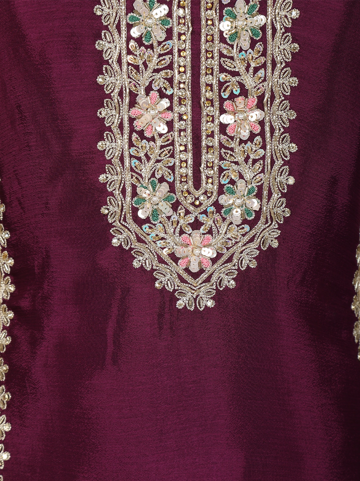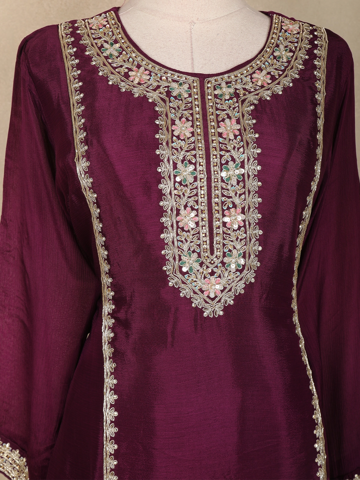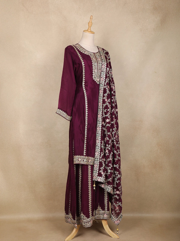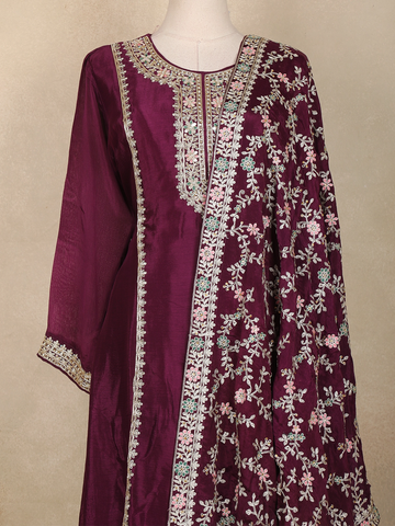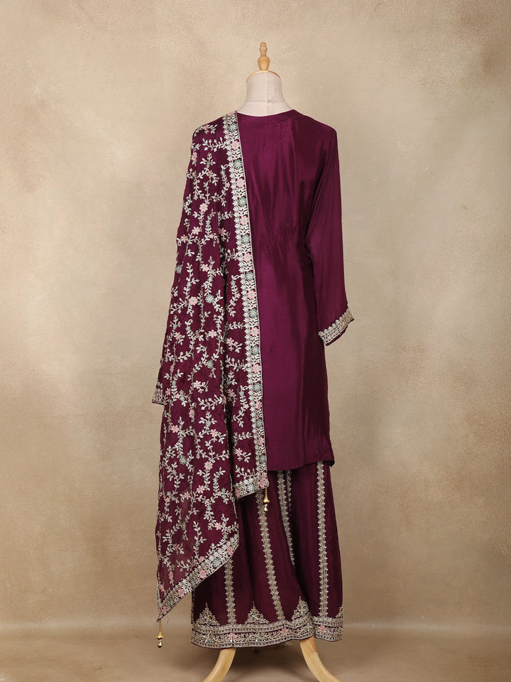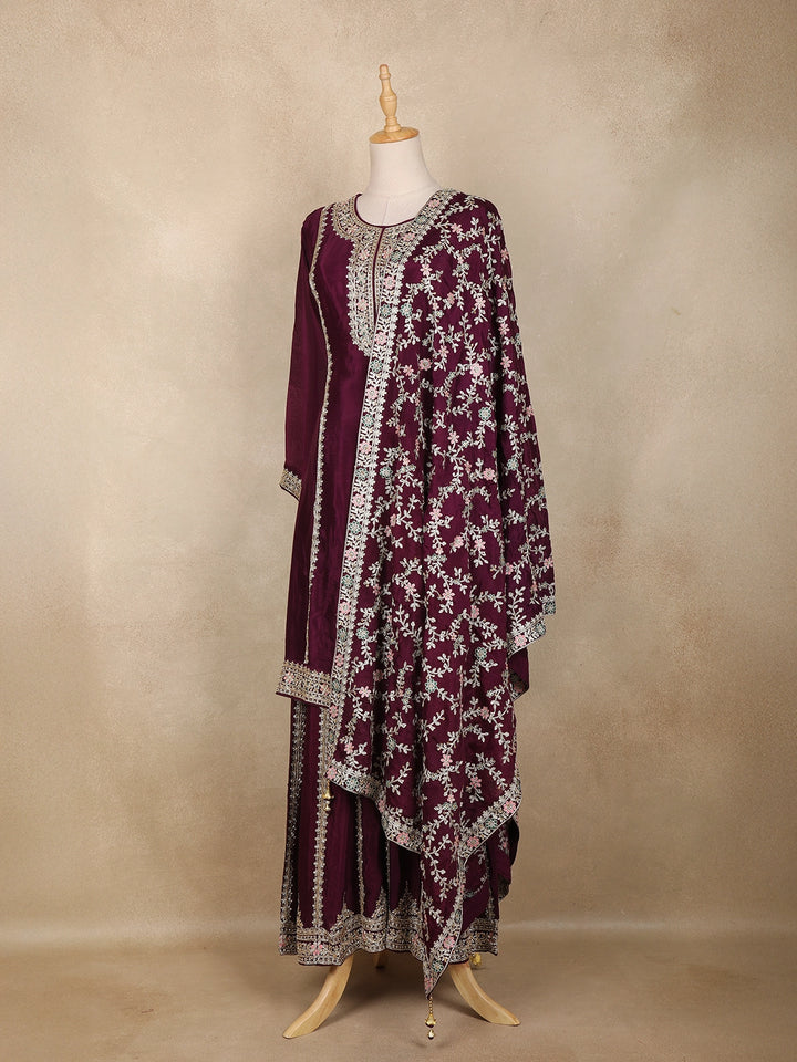Wine Floral Sequins and Thread Embroidered Georgette Palazzo Suit with Dupatta