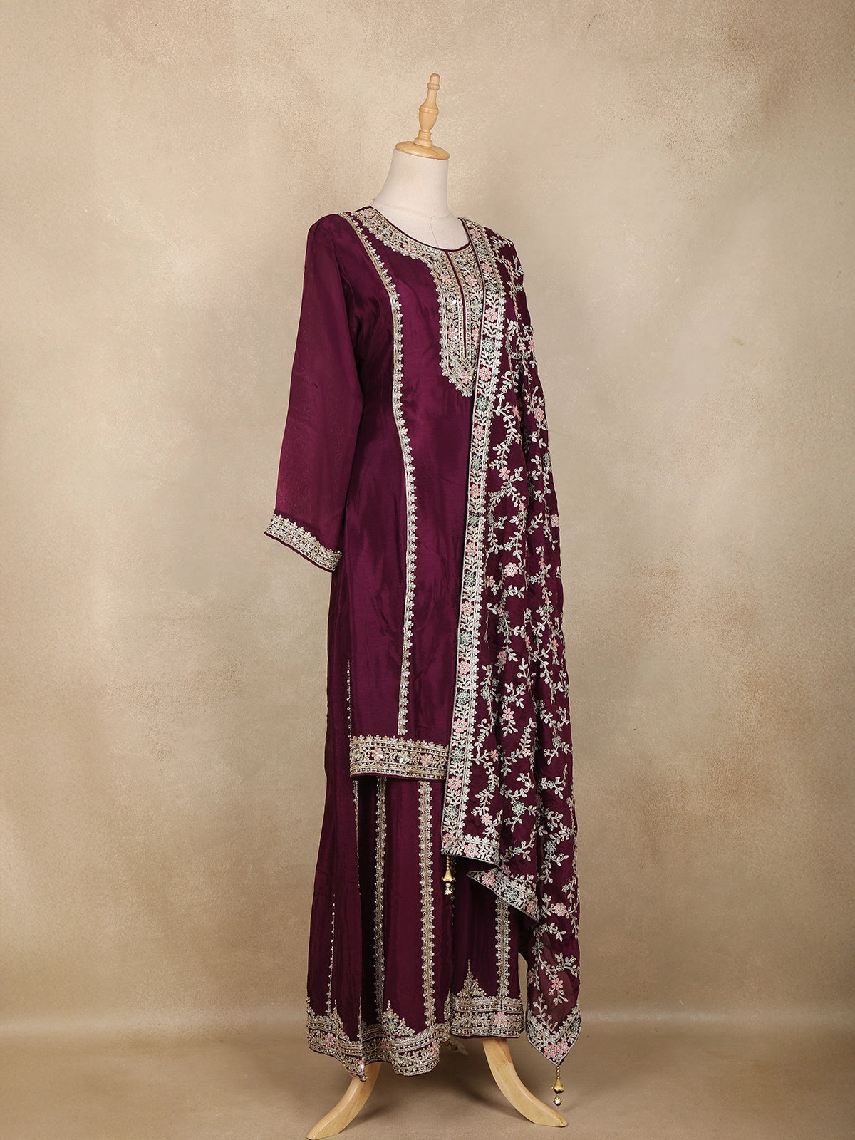 Make a graceful style statement with this elegant wine georgette palazzo suit, beautifully embellished with pastel floral motifs and delicate sequin highlights. The luxurious shine of the silk fabric paired with intricate craftsmanship brings together a traditional yet modern festive charm.