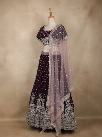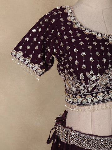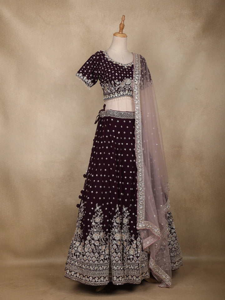 Wine Floral Sequins Embroidered Georgette Lehenga Set with Net Dupatta