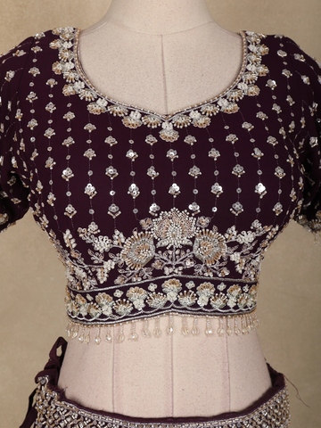 Make a glamorous entrance at every celebration with this stunning wine georgette lehenga set. The blouse is intricately embellished with floral sequins and beadwork, paired with a delicately handcrafted waistline adorned with shimmering hanging beads for added charm.