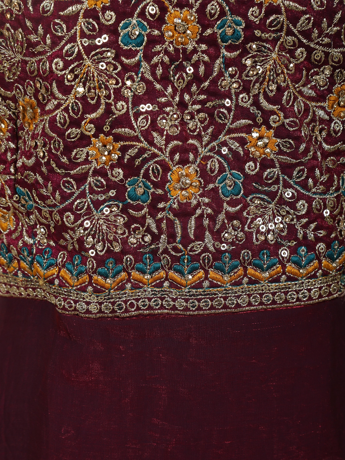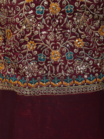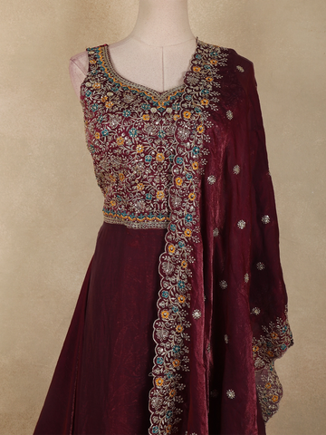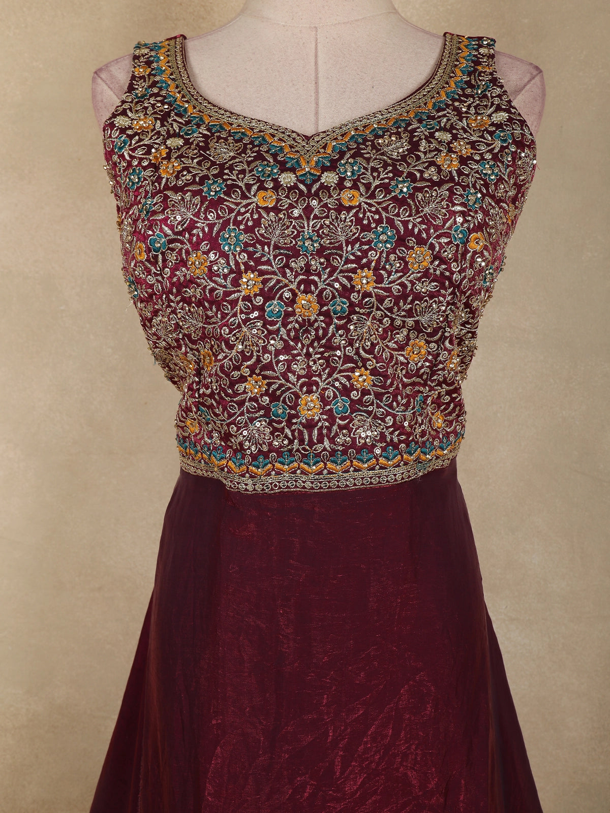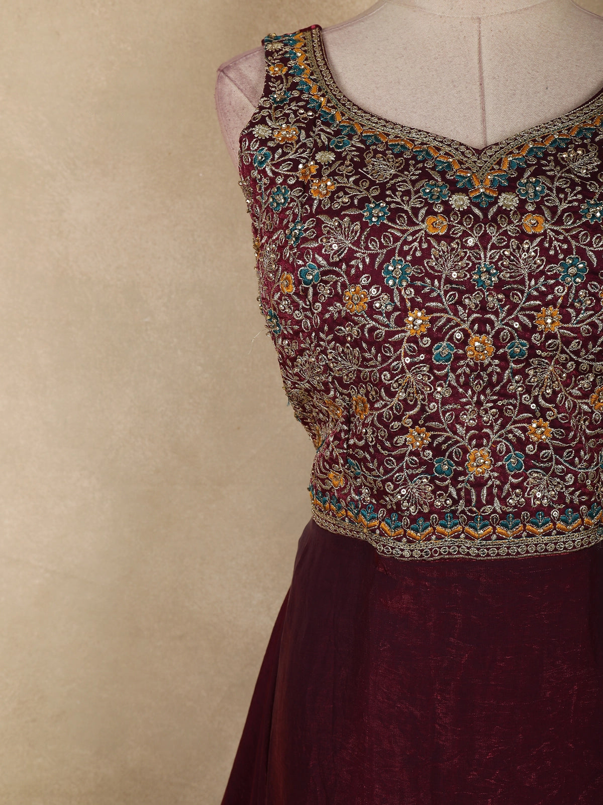 Wine Floral Thread Embroidery Design Space Silk Party Wear Gown