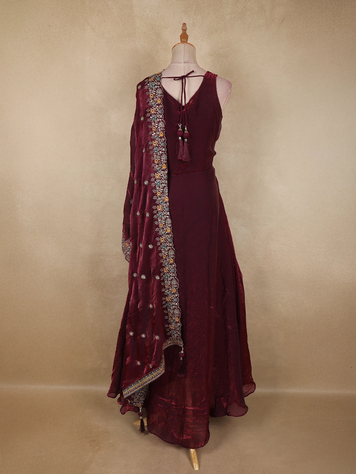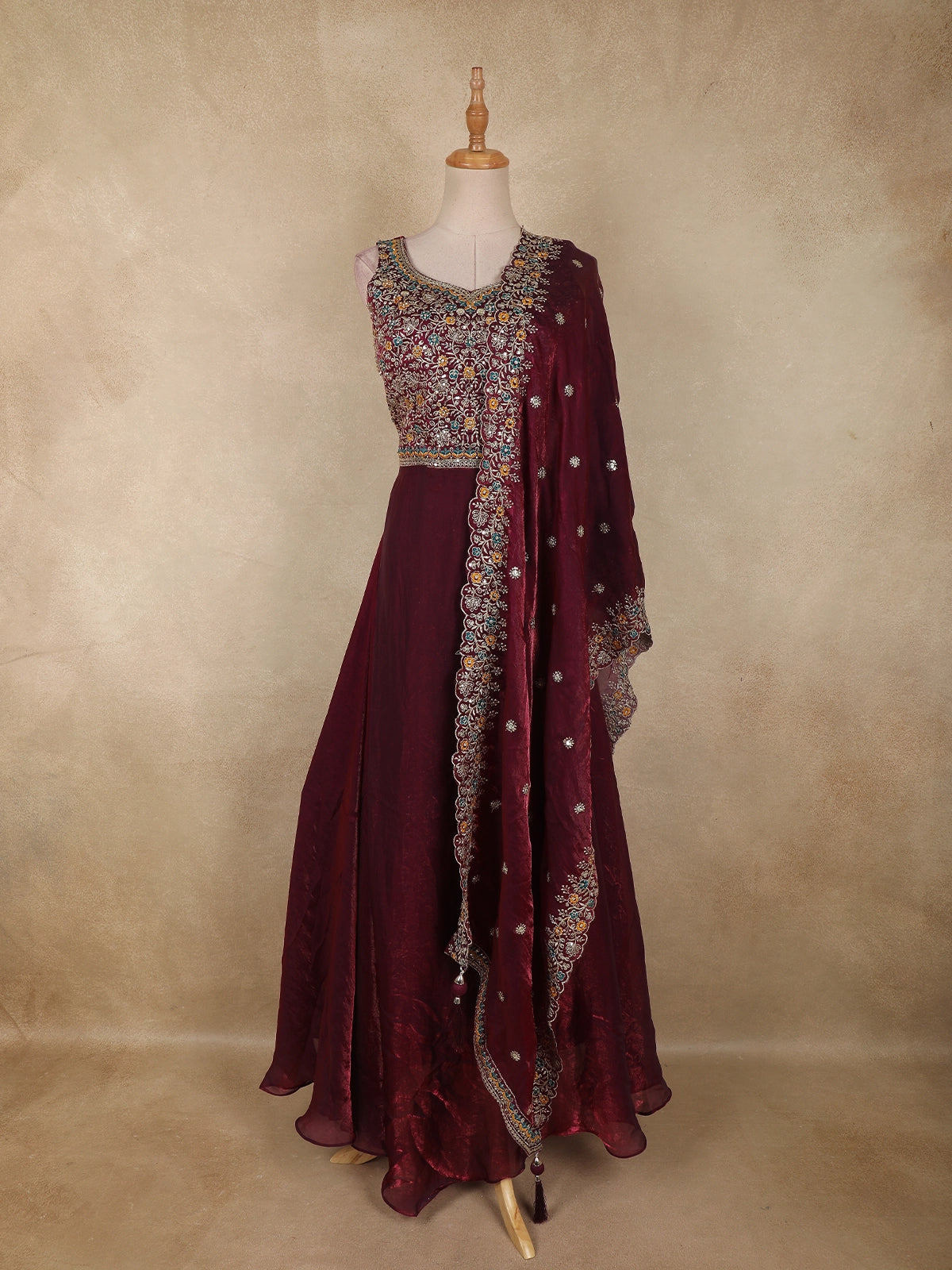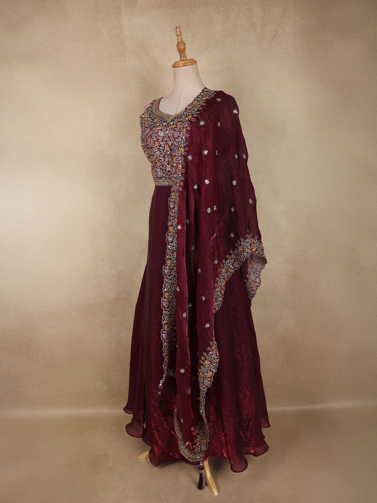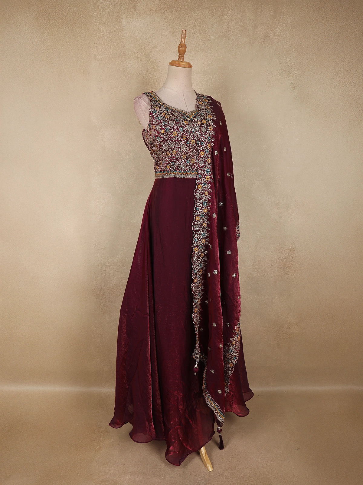 Elevate your occasion wear wardrobe with this exquisite Wine party wear gown, crafted in luxurious space silk for a refined and graceful appeal. The deep wine hue lends a rich, regal charm, making it a perfect choice for evening celebrations and festive gatherings.