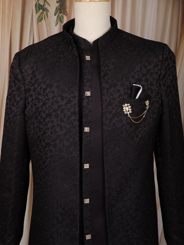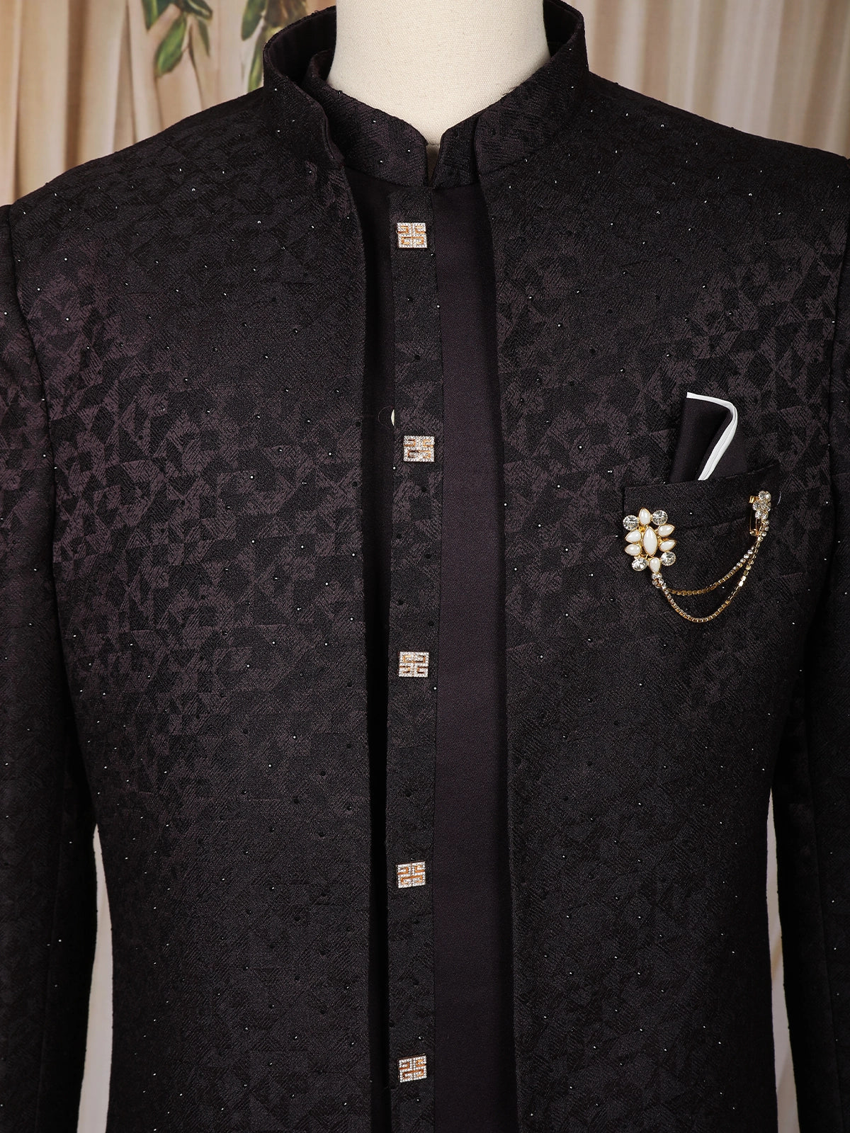 Step into timeless elegance with this classic wine Indo-Western sherwani crafted in a refined geometric-patterned textured fabric. The surface is tastefully detailed with micro-sequin embellishments, giving a subtle, sophisticated sparkle that enhances the richness of the wine tone.