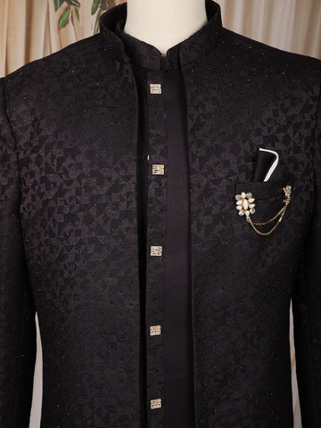 Wine Geometric Textured Embroidered Indo-Western Polyester Sherwani for Men