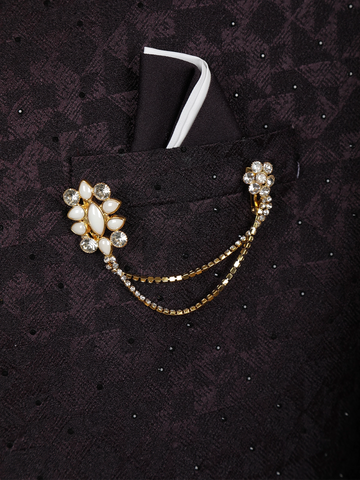 Designed with a mandarin collar and a clean, streamlined front, the sherwani features a premium layered placket accented with metallic square buttons for a modern, polished look. The chest pocket is enhanced with a crisp pocket square and an elegant detachable brooch, adding a regal charm to the ensemble.