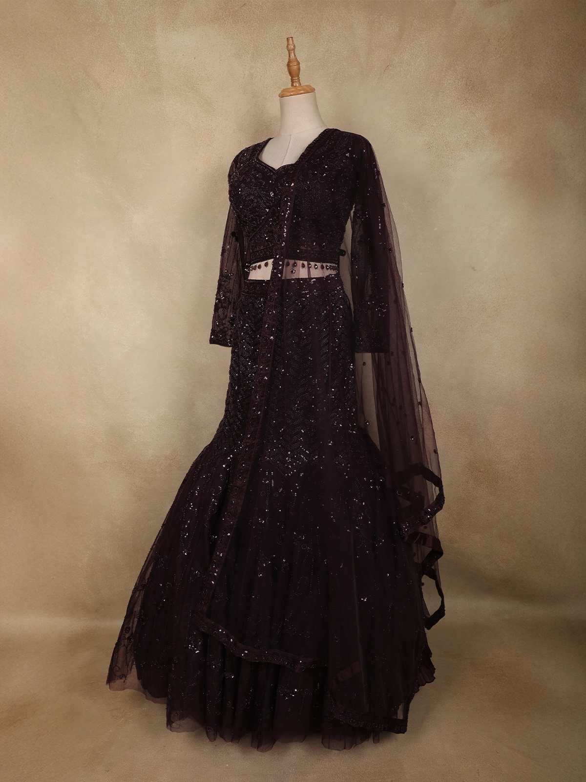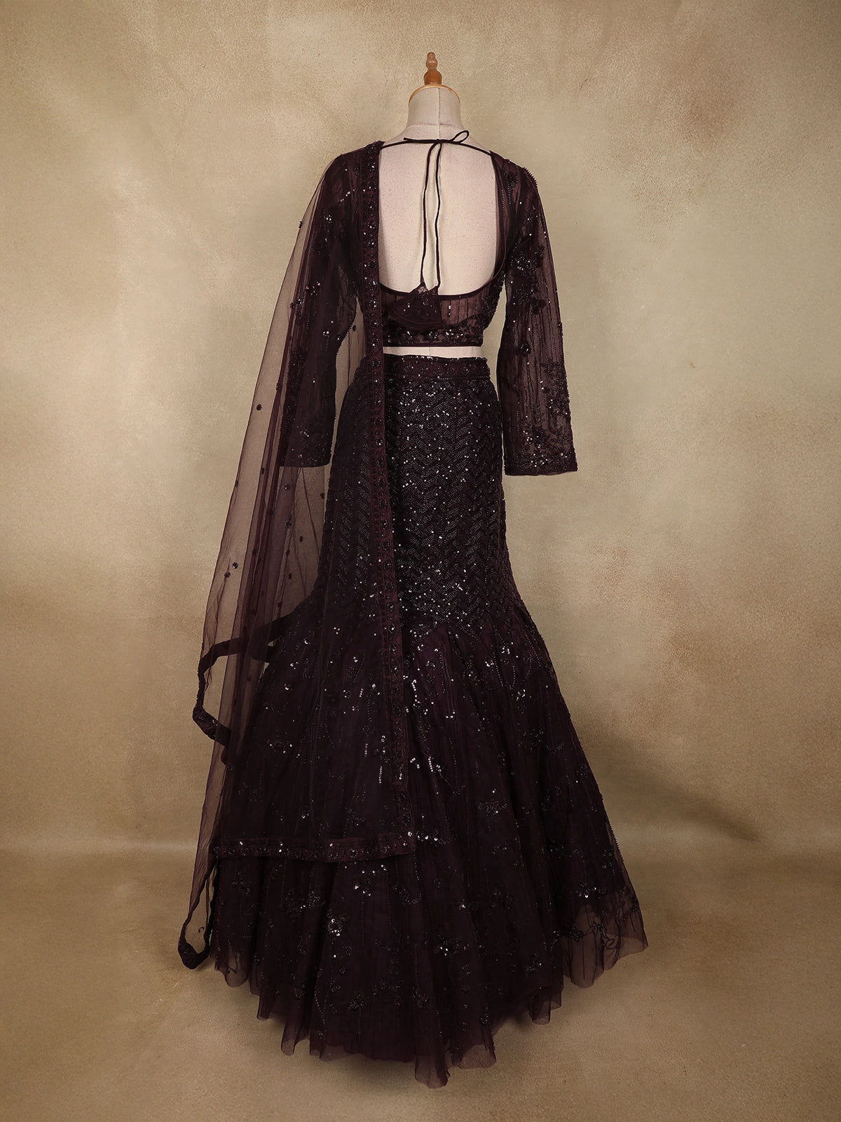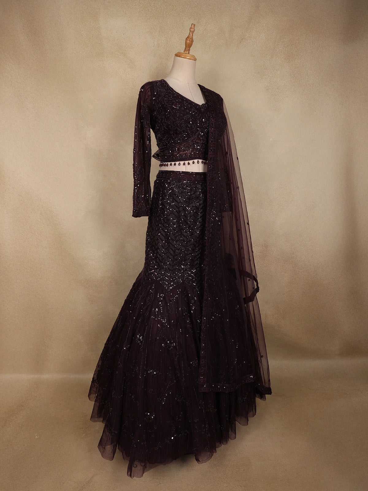 Make an unforgettable statement with this wine-colored mermaid lehenga set, designed to exude luxury, elegance, and modern glamour. Crafted in fine net fabric, this ensemble features a sculpted mermaid silhouette that beautifully accentuates the curves while flowing gracefully at the hem.