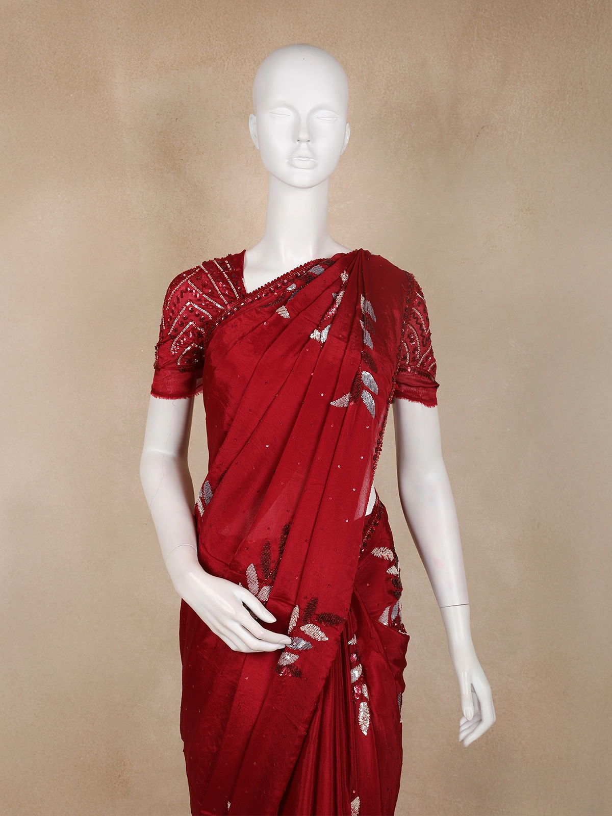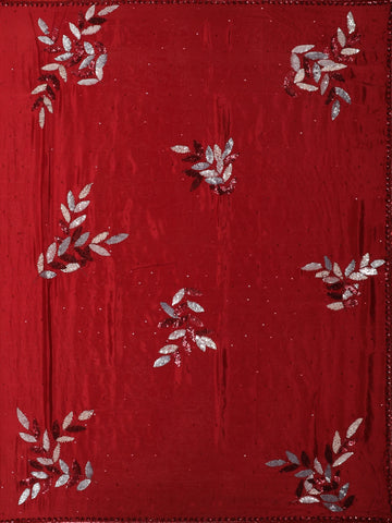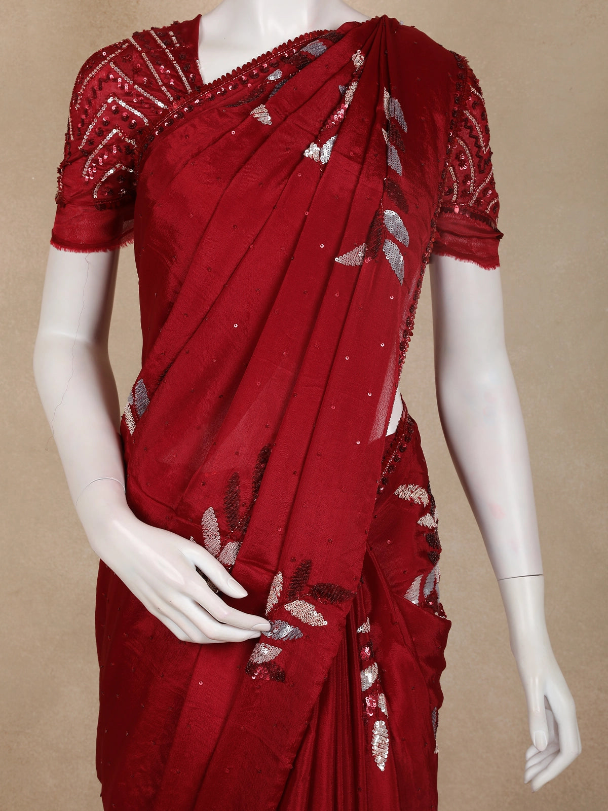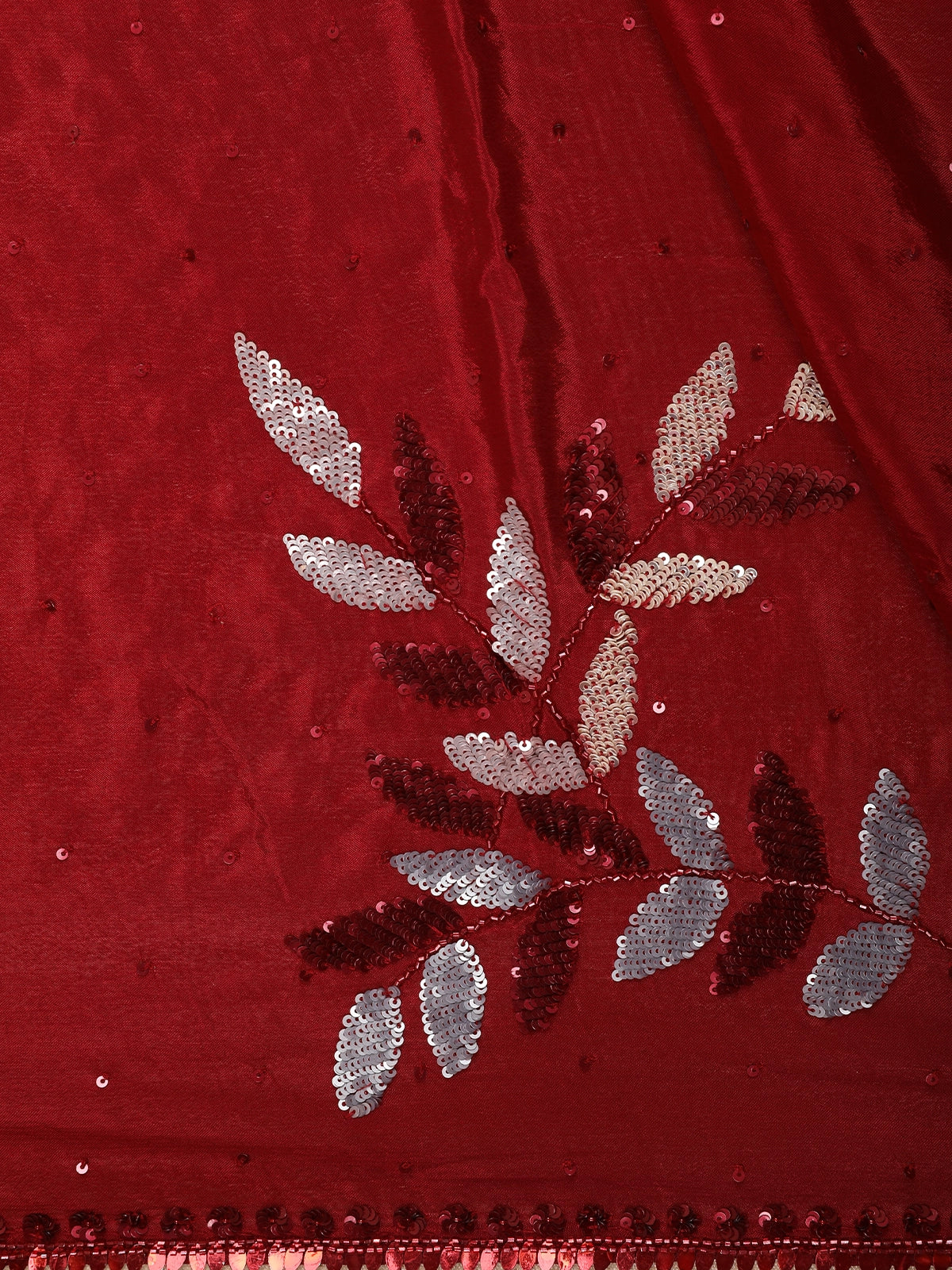 The rich wine maroon base is beautifully adorned with floral leaf motifs highlighted using shimmering sequins, adding a subtle sparkle that catches the light with every movement. Delicate scattered sequins across the body enhance the luxurious appeal, while the finely embellished border elevates the saree’s designer finish.