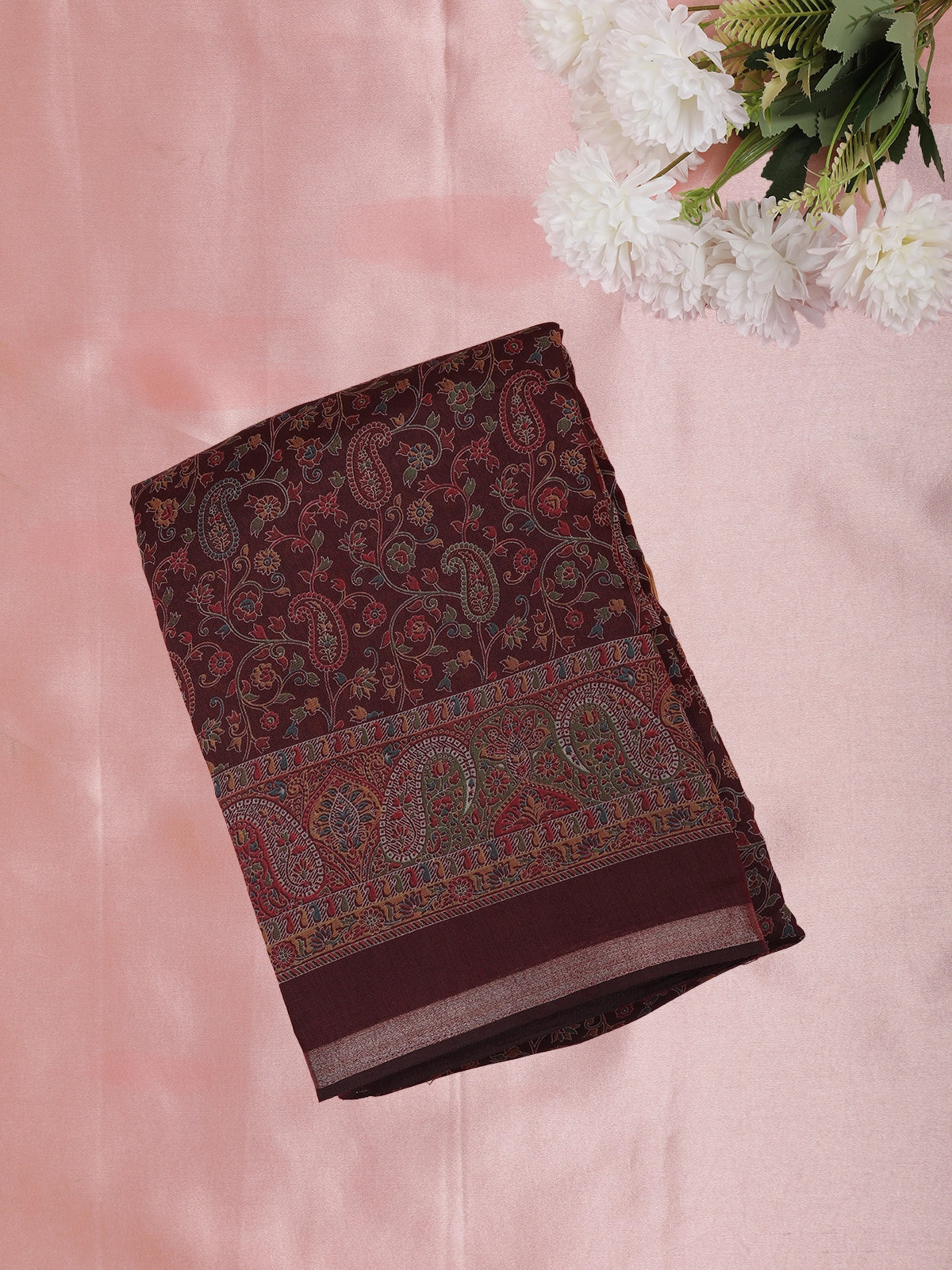 This elegant mixed silk cotton fancy saree showcases a rich Kalamkari-inspired printed design that exudes timeless ethnic charm. The deep wine maroon base is beautifully adorned with intricate paisley, floral, and vine motifs in subtle multicolour tones, creating a refined and graceful overall look.