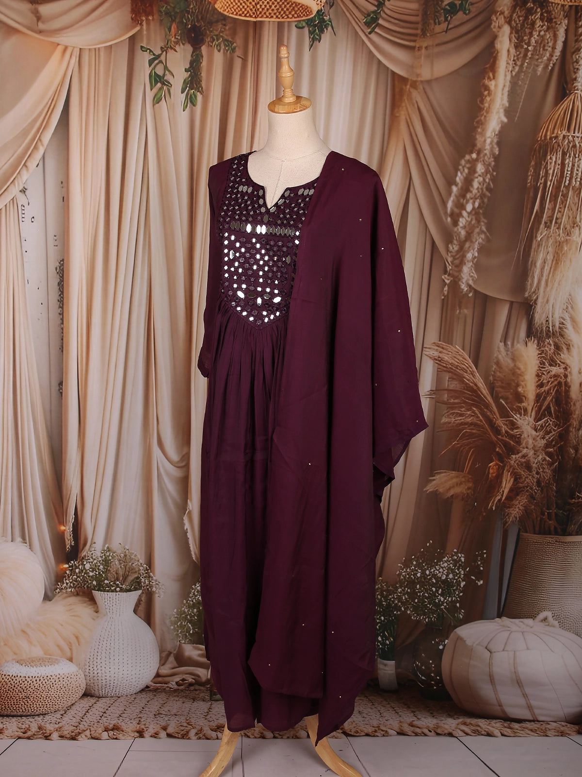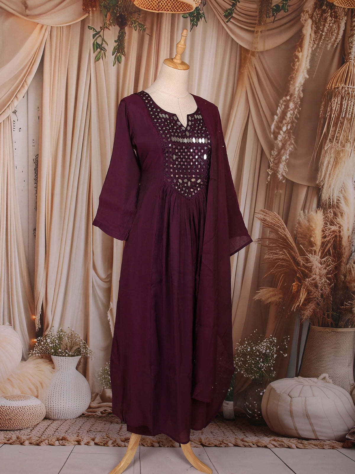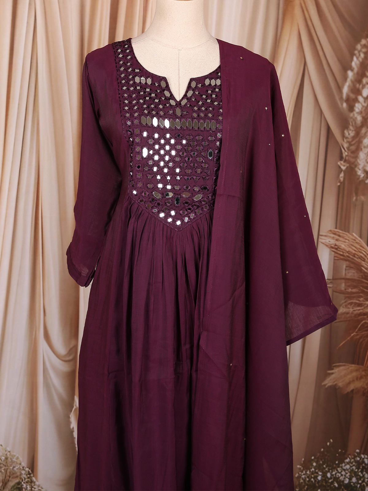 Add a regal touch to your festive wardrobe with this elegant wine cotton Anarkali salwar suit. The kurta showcases intricate mirror embroidery across the yoke, creating a dazzling play of reflections. Designed with a notched round neckline and three-quarter sleeves, it features soft gathers for a flowy, flattering silhouette. The lightweight matching dupatta with subtle mirror highlights completes the ensemble, making it ideal for festive occasions, parties, and traditional celebrations.