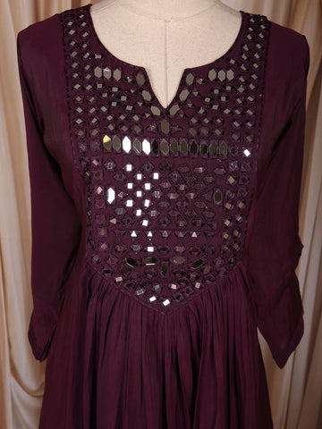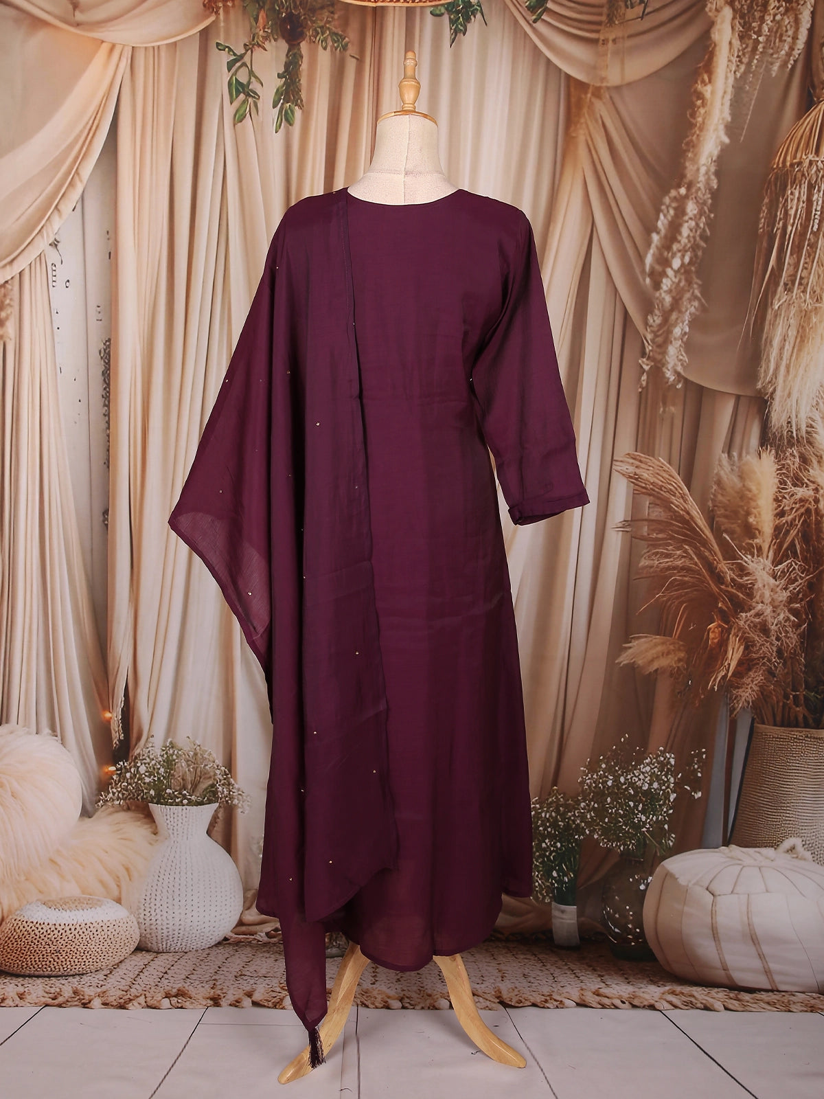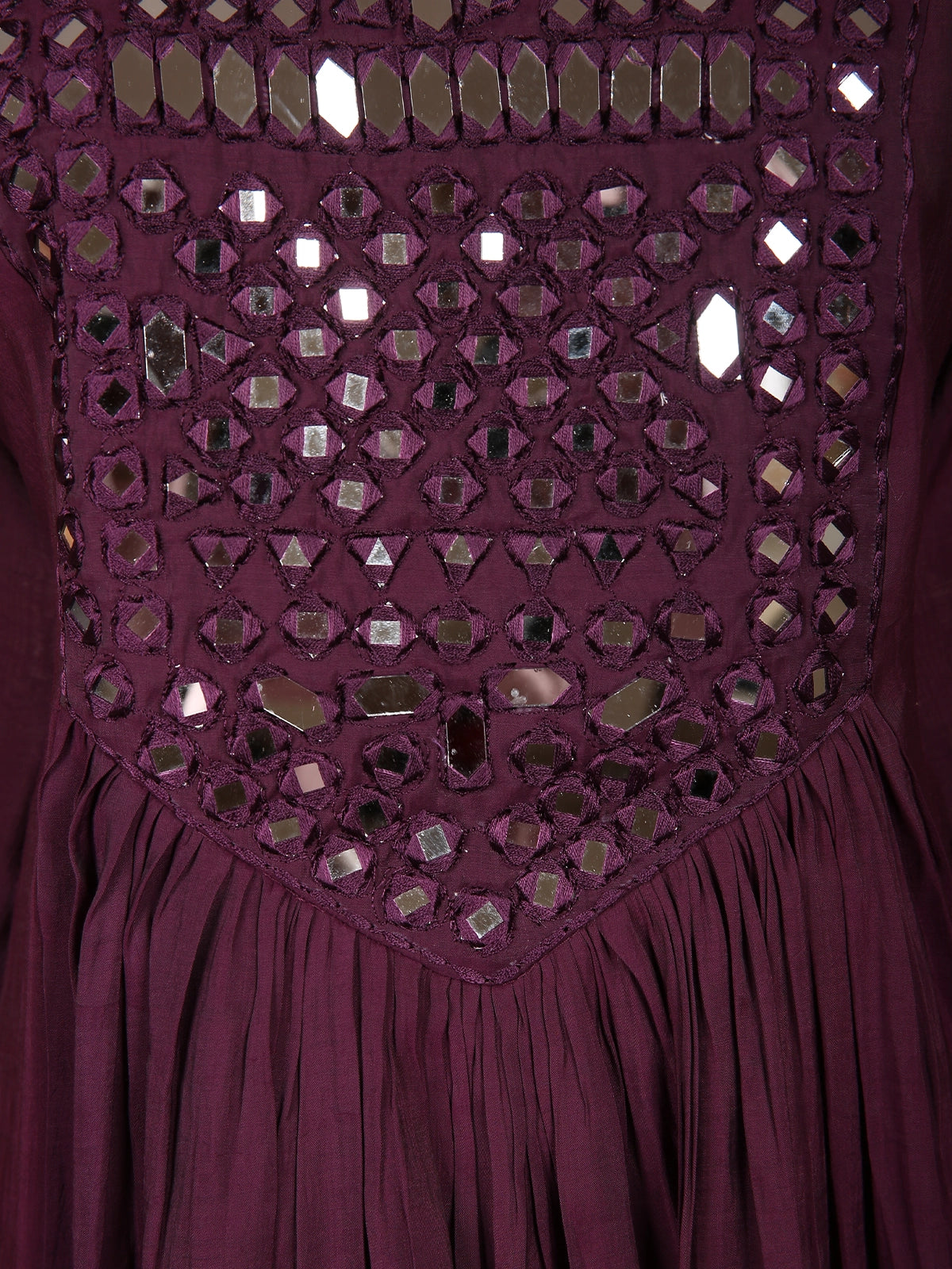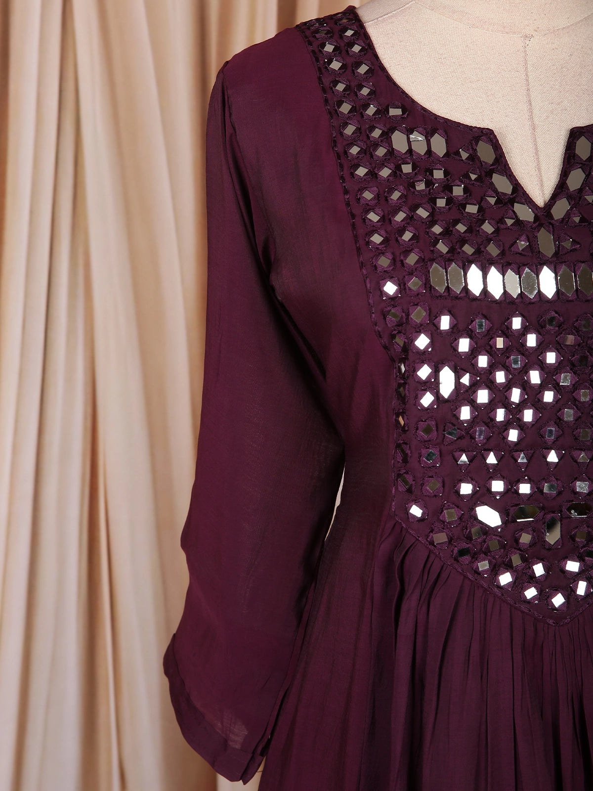 Add a regal touch to your festive wardrobe with this elegant wine cotton Anarkali salwar suit. The kurta showcases intricate mirror embroidery across the yoke, creating a dazzling play of reflections. Designed with a notched round neckline and three-quarter sleeves, it features soft gathers for a flowy, flattering silhouette. The lightweight matching dupatta with subtle mirror highlights completes the ensemble, making it ideal for festive occasions, parties, and traditional celebrations.