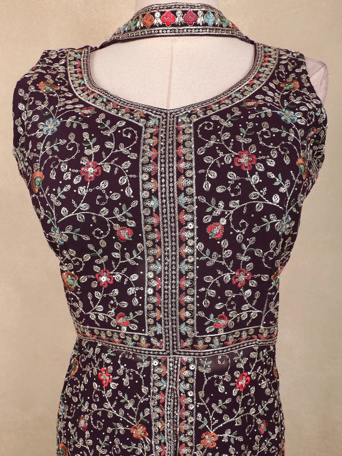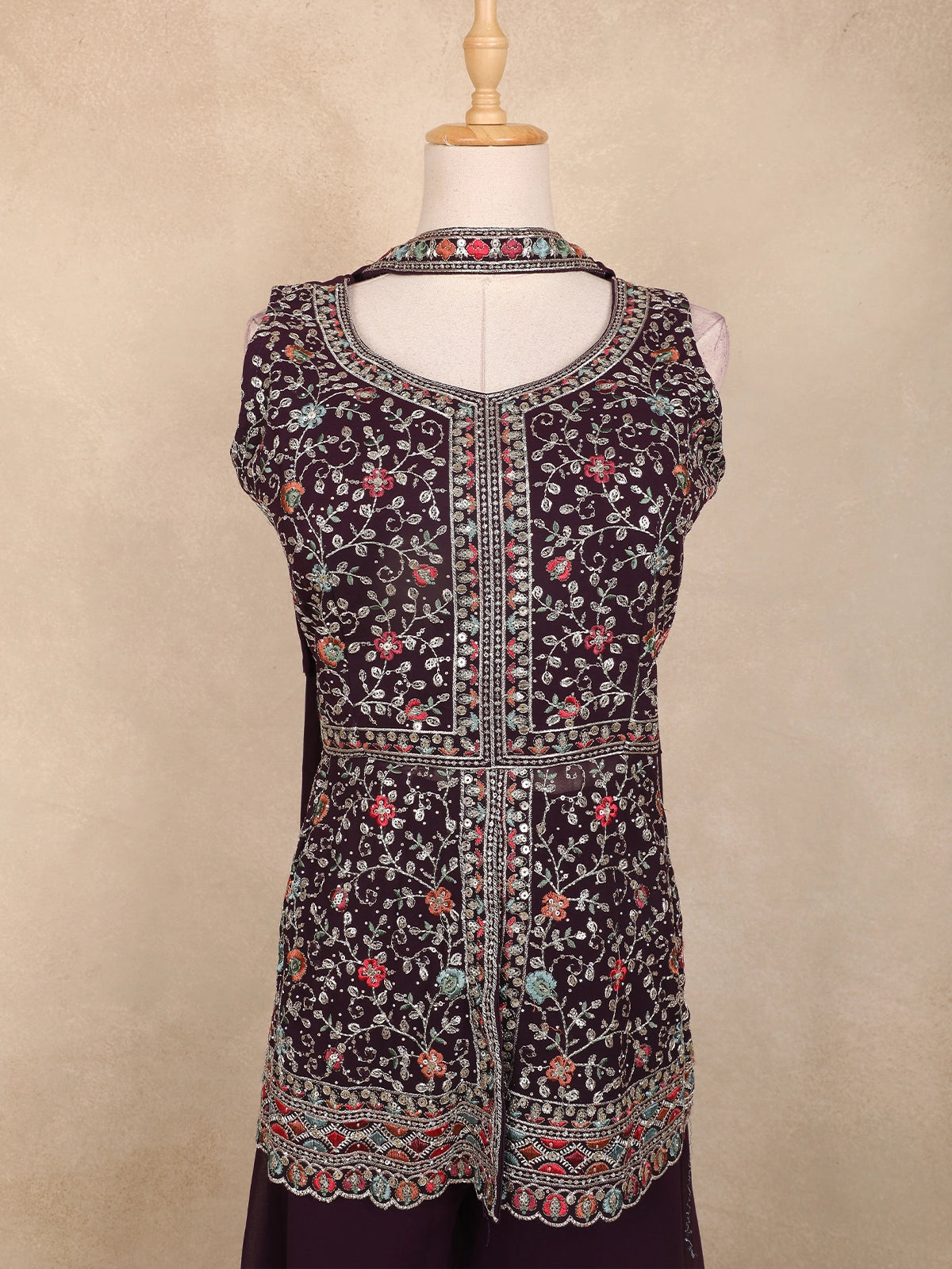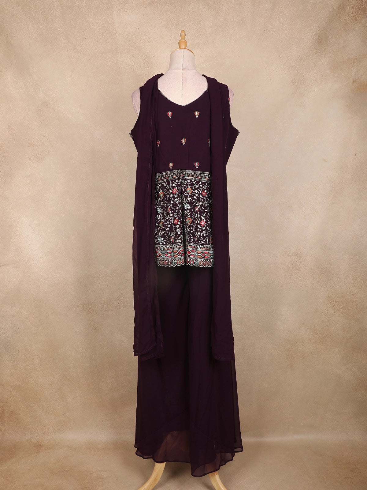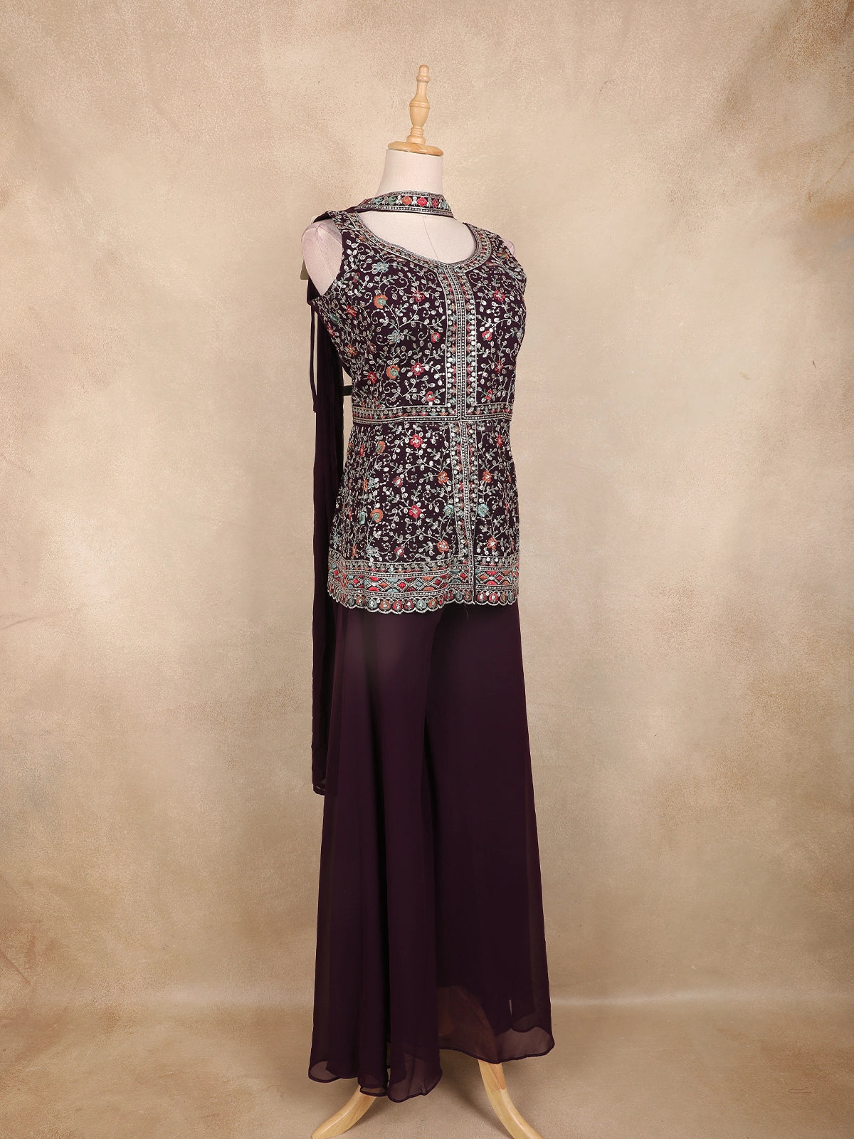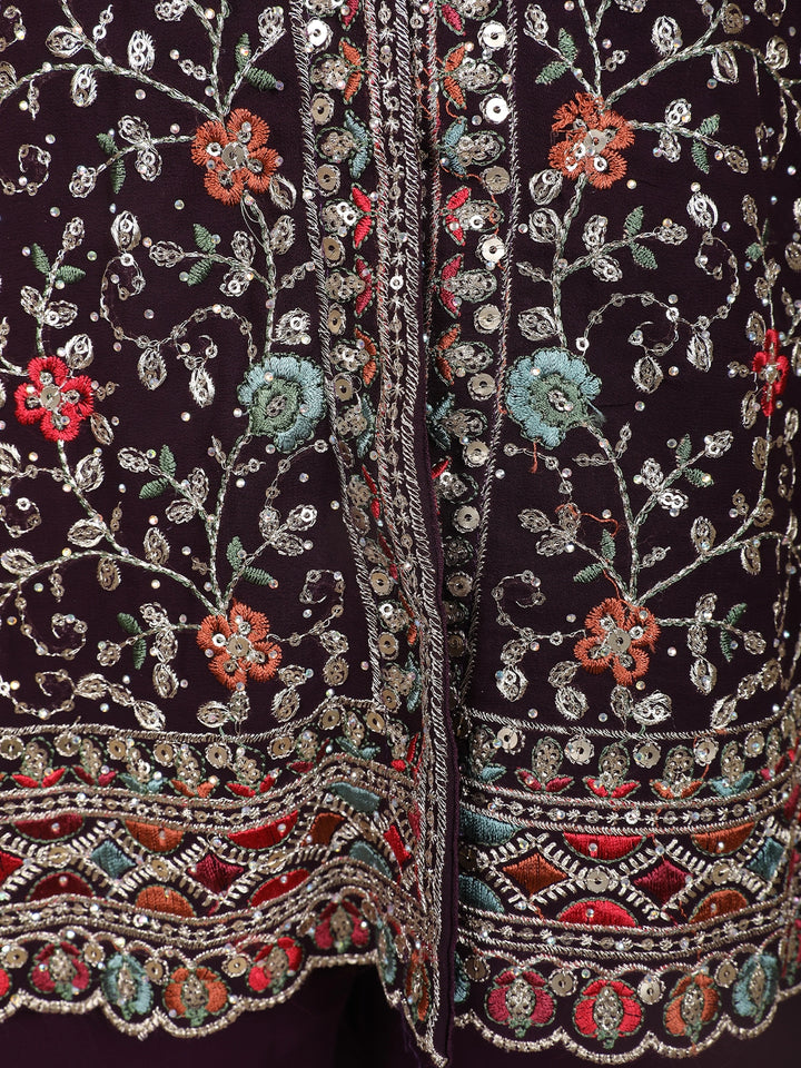 Step into refined elegance with this Wine Georgette Peplum Palazzo Suit, intricately detailed with multicolor floral zari embroidery and delicate sequin highlights. The sleeveless peplum top features a rounded V-neckline, framed with rich thread and zari work that flows into a beautifully embroidered hemline.