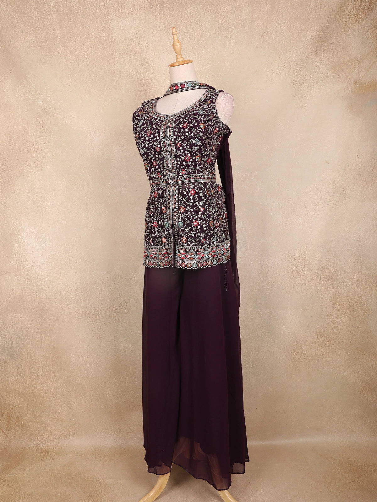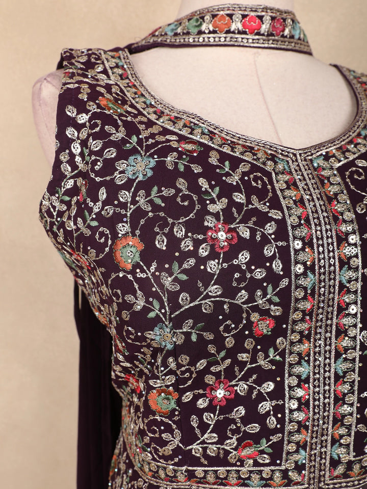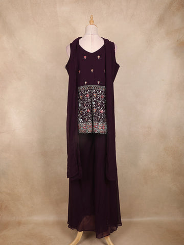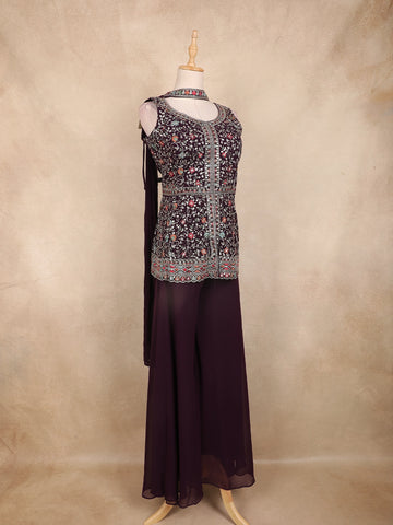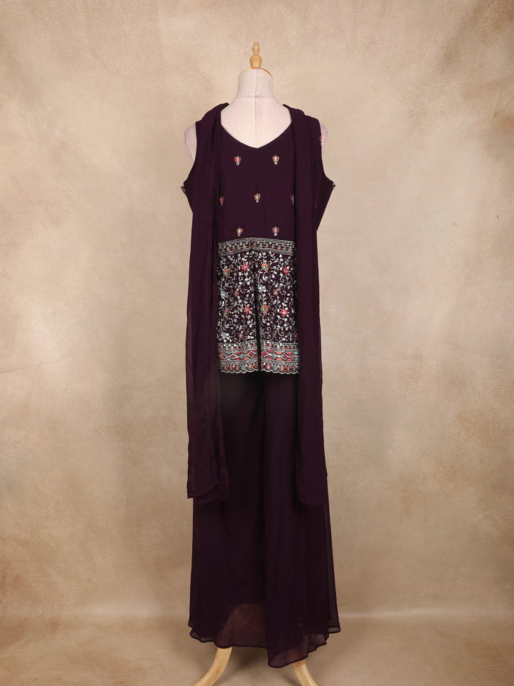 Wine Multicolor Floral Embroidered Georgette Peplum Palazzo Suit with Choker Dupatta